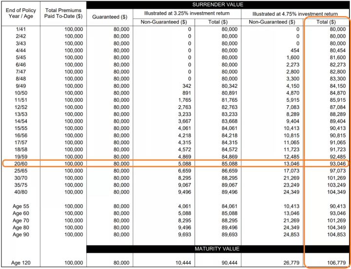 退保价值。假设客户在20年后退保,按照4.75%分红演示,可获得退保价值93,046新币