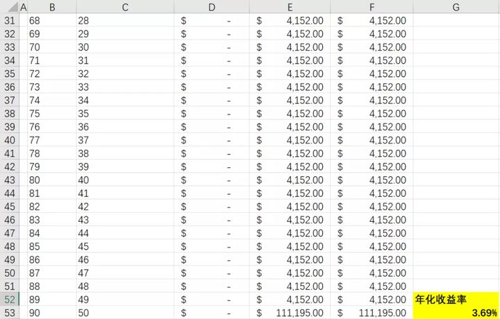 情景二:客户未中途退保,90岁末身故,此时死亡赔付为107,043新币,这一年的总现金流入为111,195新币(107,043+4,152)。此时年化收益率为3.69%。