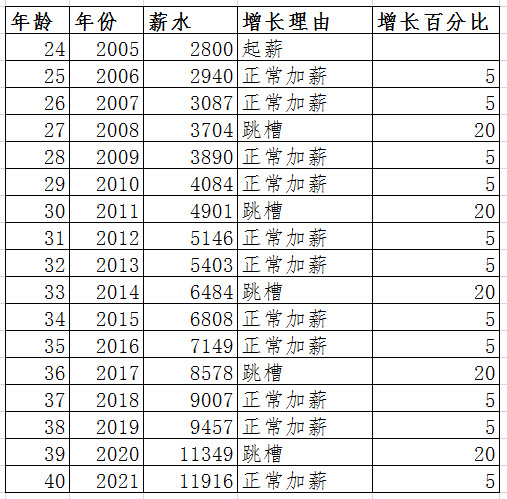 2005年,24岁,起薪2800元,年通货膨胀5%,3年跳一次,涨20%,到2021年40岁,应该是11916新币。