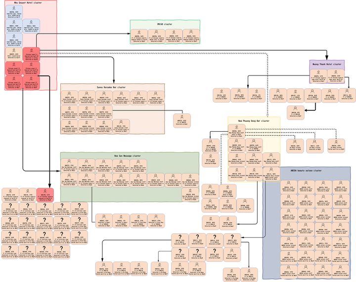 5月2日-5月7日:越南方面接到通报,赶紧回头摸排中国专家五人组的行程。首先爆出来的是永福省某卡拉OK厅(专家们4月23日刚刚解除集中隔离就跑来洗尘,果然是会玩儿的……)。从5月2日起,陆续有7位一代密接失足妇女和7位二代密接先后被检出阳性;
