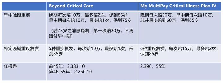 我们分别选一款比较有代表性的返还型重疾险和消费型重疾险做个对比。返还型的我们用友X公司的Beyond Critical Care,消费型的我们用英X华公司的My MultiPay Critical Illness Plan IV。同样30岁不吸烟女性,购买基础保额为10万新币,两款产品的主要特征对比如下: