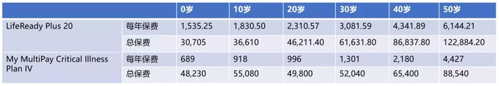 我们分别选择市场上性价比较高的终身重疾险和定期重疾险来举例。终身产品我们选择宏X公司的LifeReady Plus 20 + 早中晚期重疾附加险,晚期基础保额7.5万新币,早中期基础保额2.5万新币,70岁前×4倍(晚期30万,早中期10万),20年缴清。定期产品我们选择英X华公司的My MultiPay Critical Illness Plan IV,首次晚期保额30万新币,首次早中期保额10万新币,保到70岁。受保人均为不吸烟男性,不同的投保时的年龄对应的保费如下: