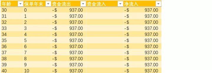 我们再来计算一下这款返还型产品的内部收益率(IRR),也就是说我们把相比之下多交出去的保费当作一种投资,而最终的收益是返还的保费总额,那么这个投资的年化收益率有多少?