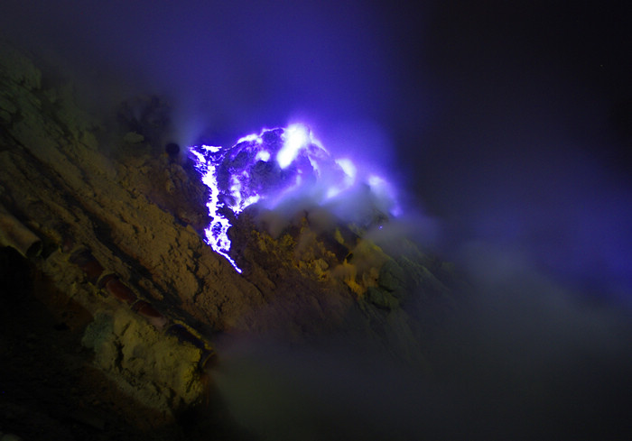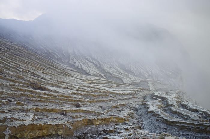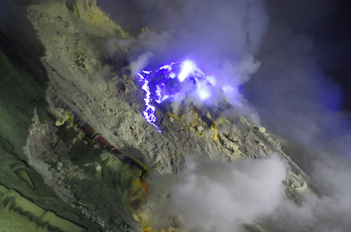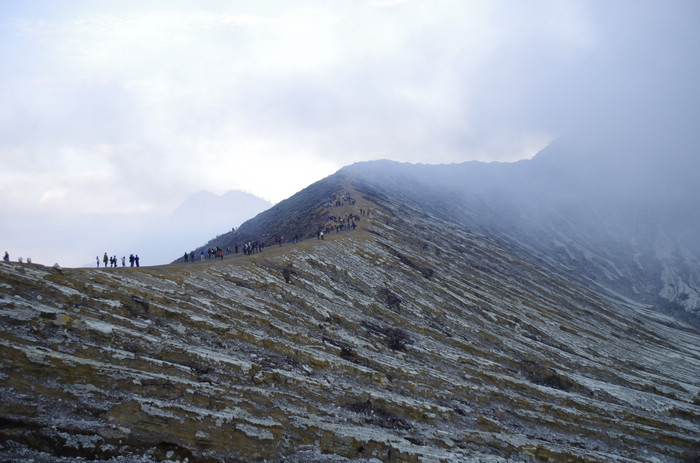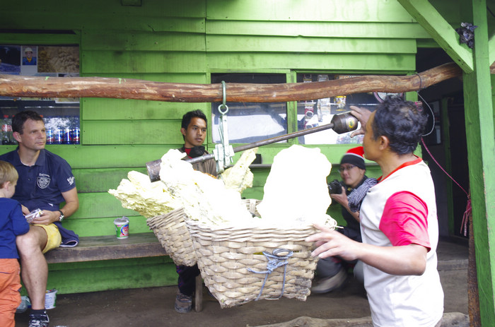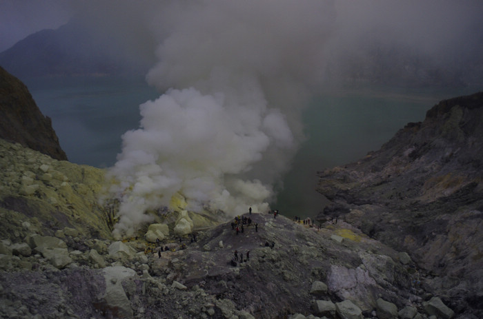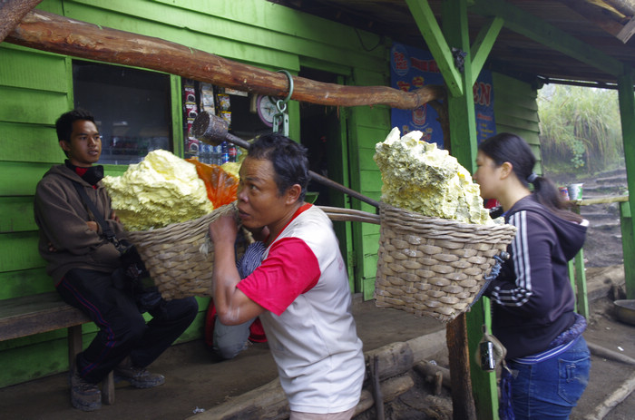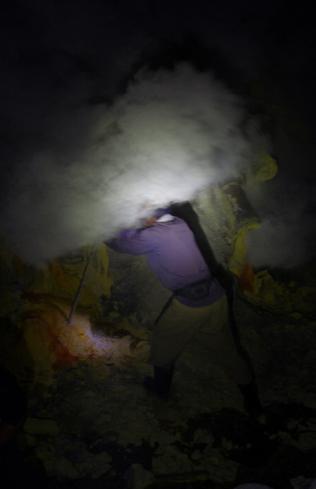 ijen火山不断地往外喷着带硫磺的蒸汽,人们在那里修建冷凝管,让硫磺冷凝固结,矿工们砸下硫磺块带到山下的矿业公司。据说矿工一般每天能挑2到3次,通常每次有75公斤,一天能赚10到15新币。相对需要挖坑道钻地开矿而言,采集露天硫磺矿的危险是小了很多,但是硫磺蒸汽对呼吸系统伤害大,谋生艰难啊。路上遇到的矿工,有时候会招呼游人买东西,我看到的是一个像花一样的黄色咚咚,让我想到了小时候妈妈做的花样的糕点,还以为是食品,觉得在这种环境实在不适合吃东西就都拒绝了。后来在火山口里面看到这些东西原来是矿工们用还没固结的液态硫磺浇到模子里面做出来的小工艺品。