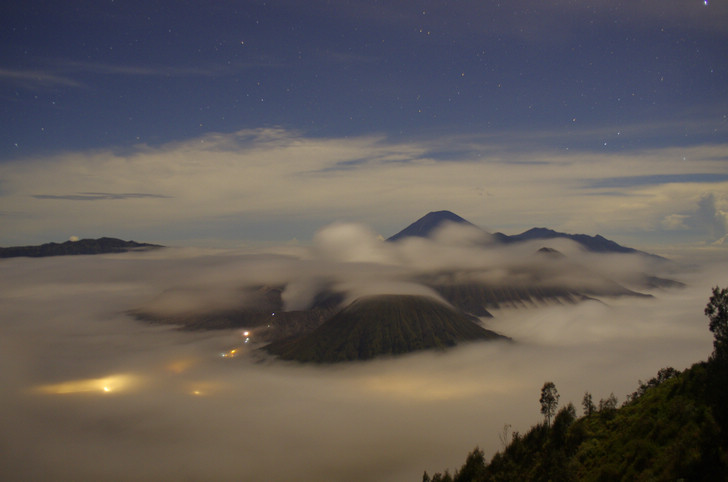 当夜才睡两个多小时,三点多我们就起来,乘坐四驱吉普车去看火山了,一路上有很多这样的车子。在快抵达观景台的时候吉普和摩托车已经非常密集,导游决定放弃最高观景台,带我们去了一个更近的地方,饶是如此,我的脚架还是只能架在最边上无法面对日出的地方,万幸还能面对火山。当天满月刚过,月光足够照亮山和林的轮廓,远处火山还在不断的往外喷着白烟,周边的云海把各个山头隔成了孤岛。这个时候的云海还不是很厚,云层下面来往的车流,和登山的人们散发出的灯光得以透出,给这神秘的夜和海添加许多生气。