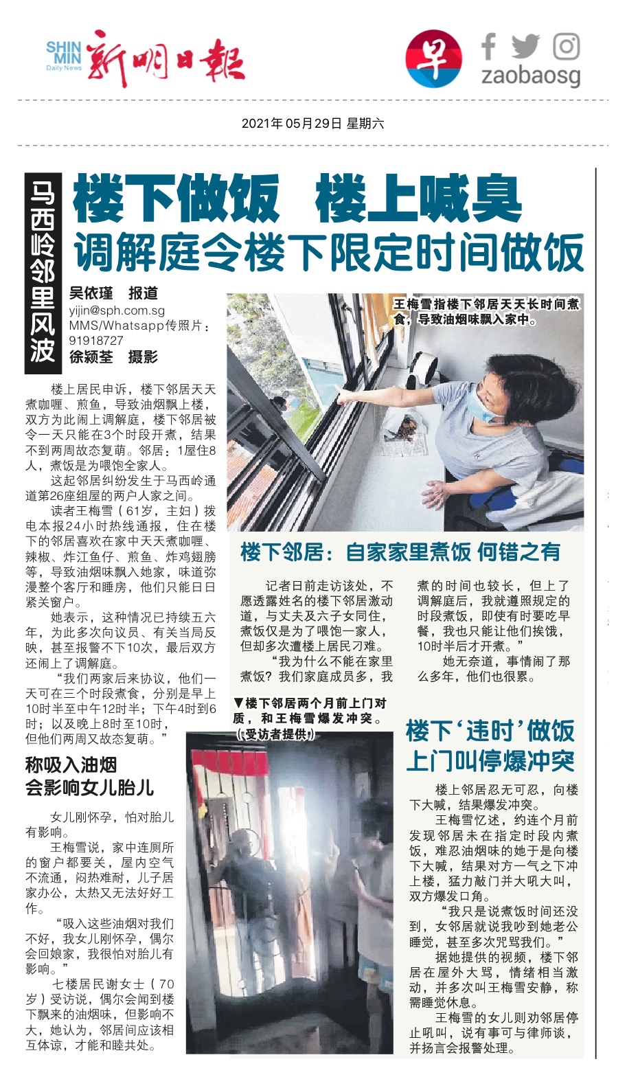来自 / 新明日报 文 / 李思发布 / 2021年5月29日 2:55 PM 谢女士解释,事后会自行清理,不会弄脏走廊。(陈佩敏摄) 端午节将至,七旬老妇在组屋走廊烧炭煮粽,却被邻居指浓烟刺鼻,且存火患风险。 还有多两周就是端午节,住在直落布兰雅弯(Telok Blangah Crescent)第6座组屋的居民谢女士(76岁),近日已包好100个粽子,提前庆祝端午节。 不过,与其他人的烹饪方式不同,她在走廊电梯口,用传统炭火煮粽子。