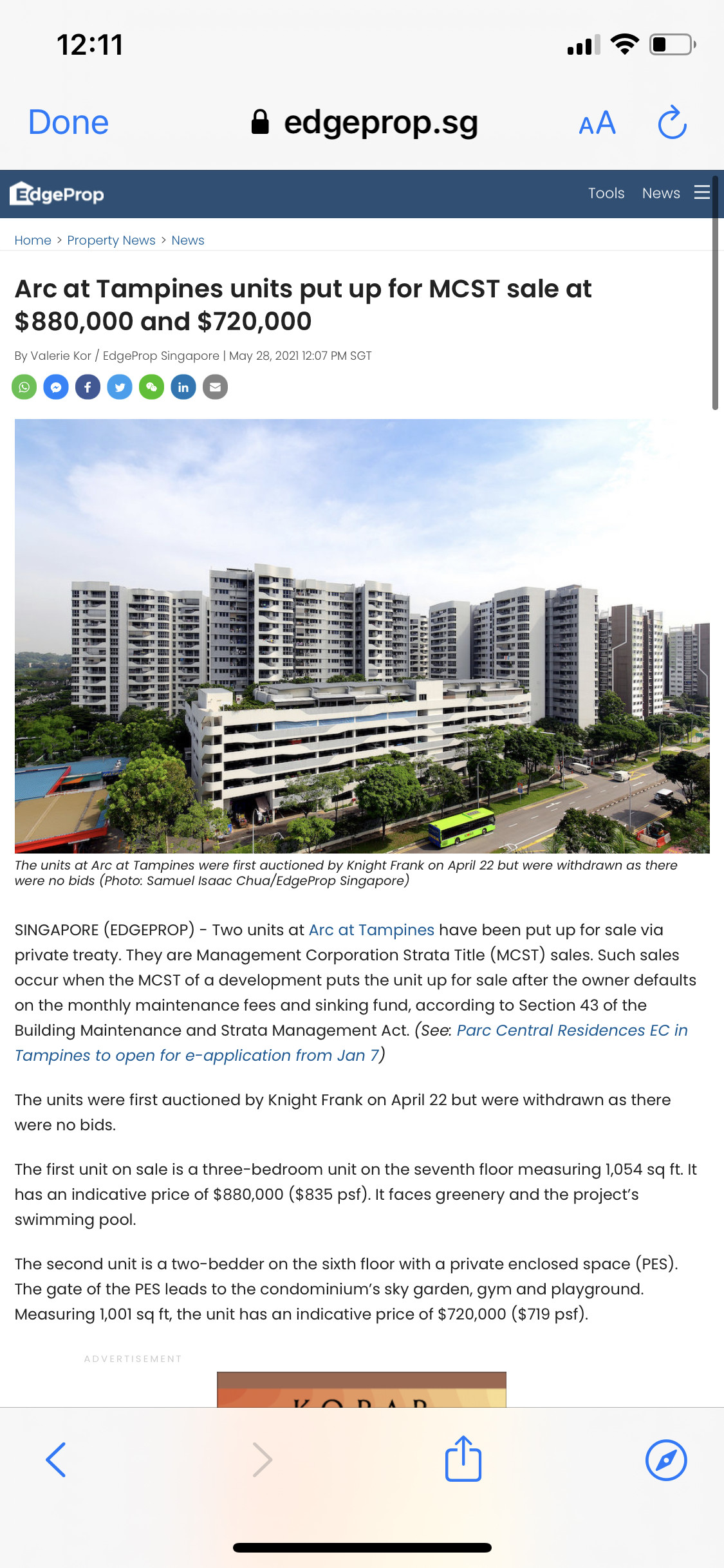 DengWei • • 4095 次浏览https://www.edgeprop.sg/property-news/arc-tampines-units-put-mcst-sale-880000-and-720000#.YLRhMGsb7b4.wechat 太悲惨了,敢欠物业管理费,直接把房子给你拍卖了,扣了手续费和欠费+罚款和房贷后,剩的钱才退给你。