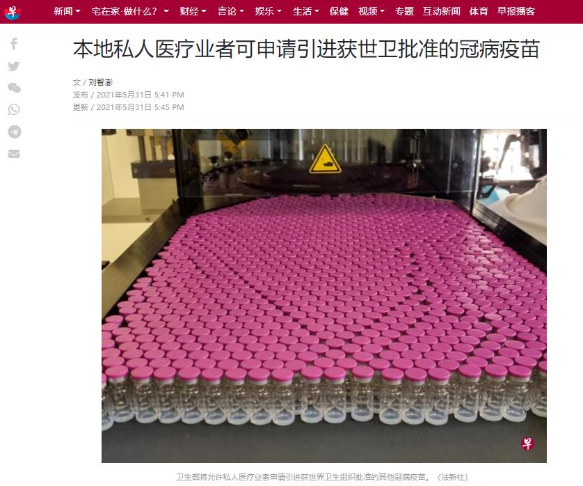 NewOriental • • 4085 次浏览【早报讯】为提高我国疫苗接种的整体覆盖率,卫生部将允许私人医疗业者申请引进获世界卫生组织批准的其他冠病疫苗。