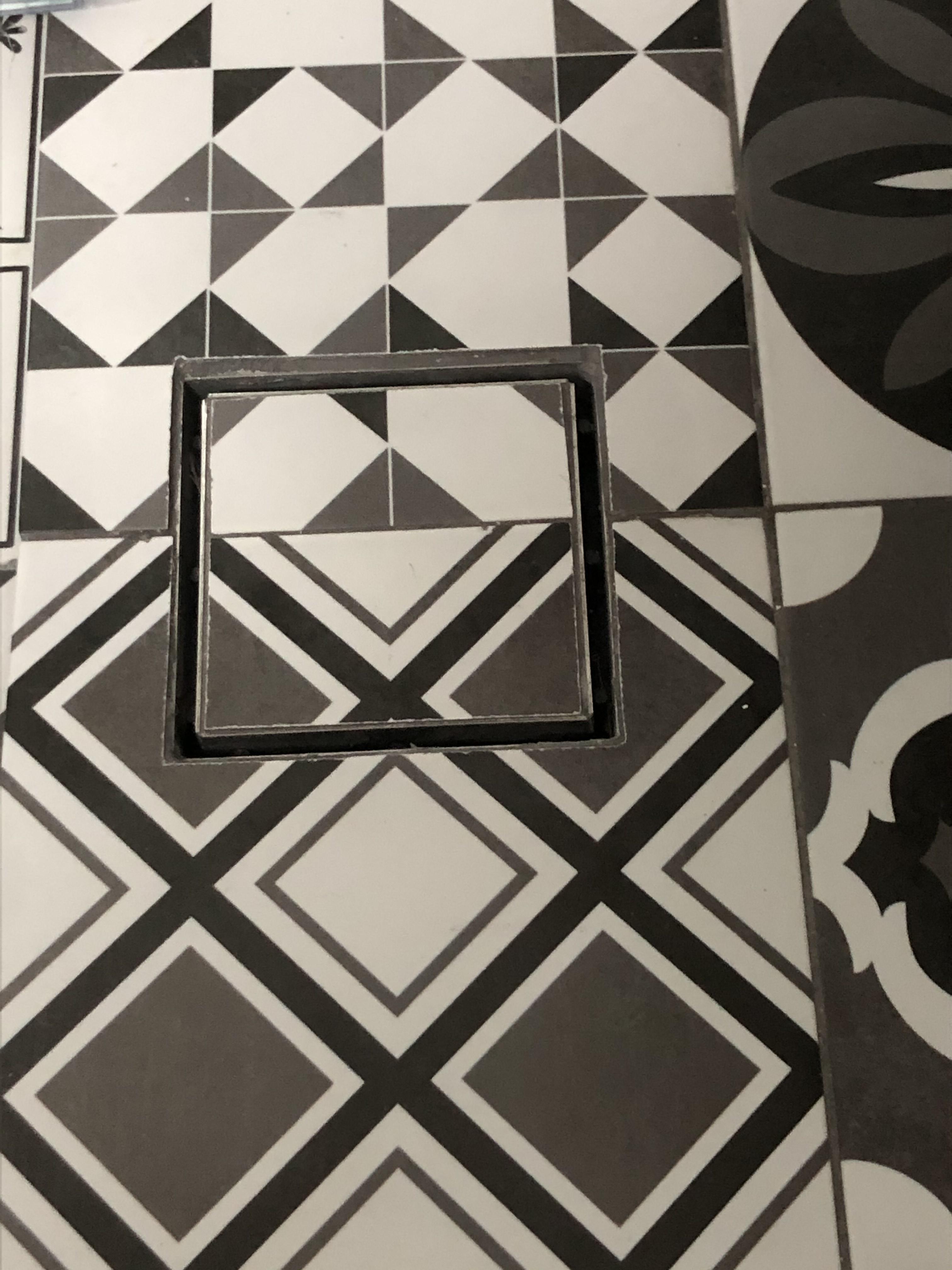 地漏我再发张细节图这张因为有花纹看得更清楚。然后淋浴湿区比干区低,干湿区隔开就不用有curb了,淋浴湿区也是有个斜度方便水流走。其实这些都是挺常见的,但我自己没经验没想到这些,装修大叔不用我提都帮我想到了