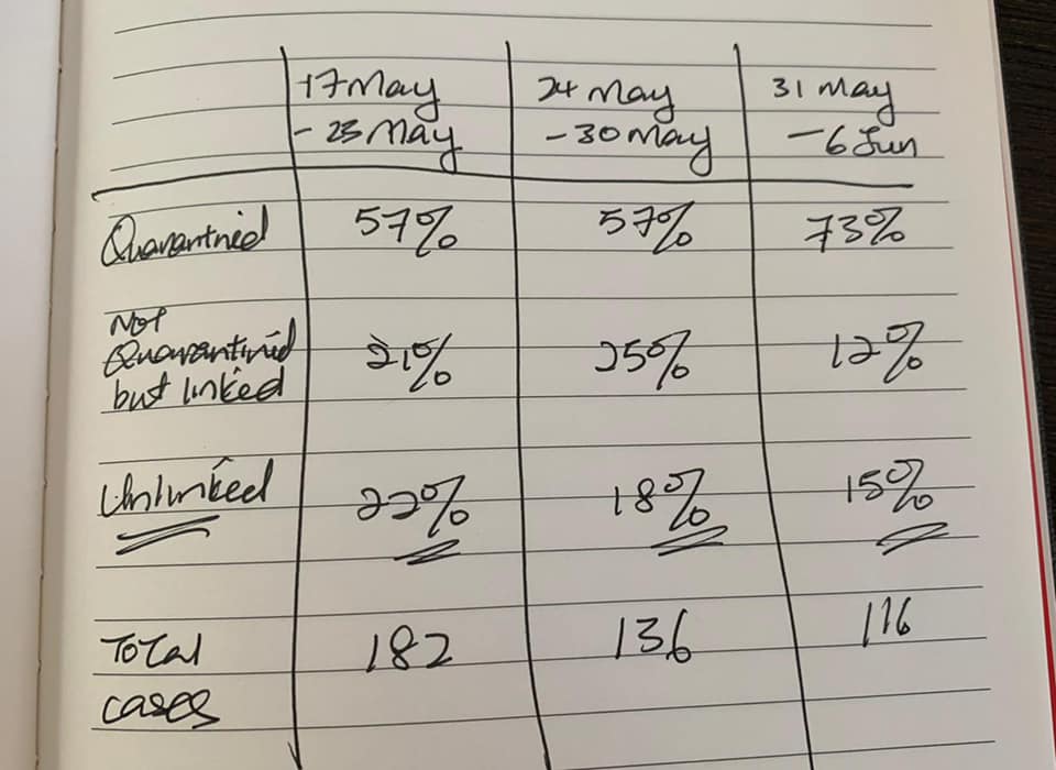 这些数据和结果表明过去三周的高度警戒措施还是卓有成效的,卫生部长王乙康也在脸书分享他自己手写的数据监控:确诊人数已从五月中的182起显著减少至116起,无关联比例也从22%下降至15%。