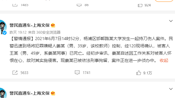 据上海市公安局“警民直通车-上海文保”微博发布的警情通报,昨天下午2时52分,杨浦区邯郸路某大学发生一起持刀伤人案件。民警迅速到场将犯罪嫌疑人姜某(男,39岁,该校教师)控制,经120现场确认,被害人王某(男,49岁,系姜某同事)已死亡。(微博截图