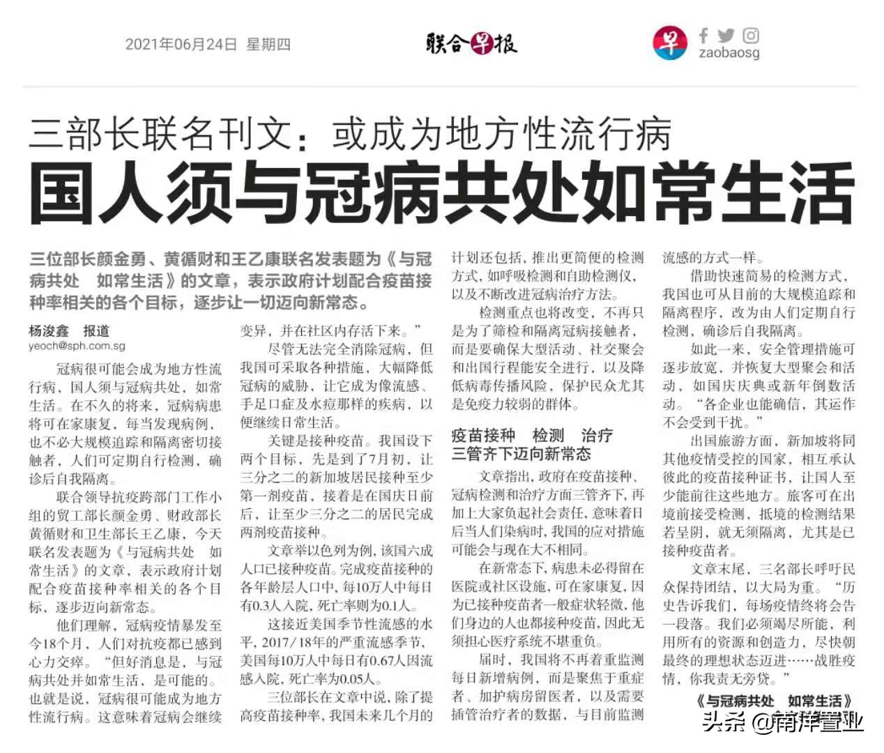 6月24日,贸工部长颜金勇,财政部长黄循财和卫生部长王乙康在新加坡本地媒体发布联名刊文《与冠病共处 如常生活》,呼吁新加坡民众不惧病毒,迈向与其共生的新常态。