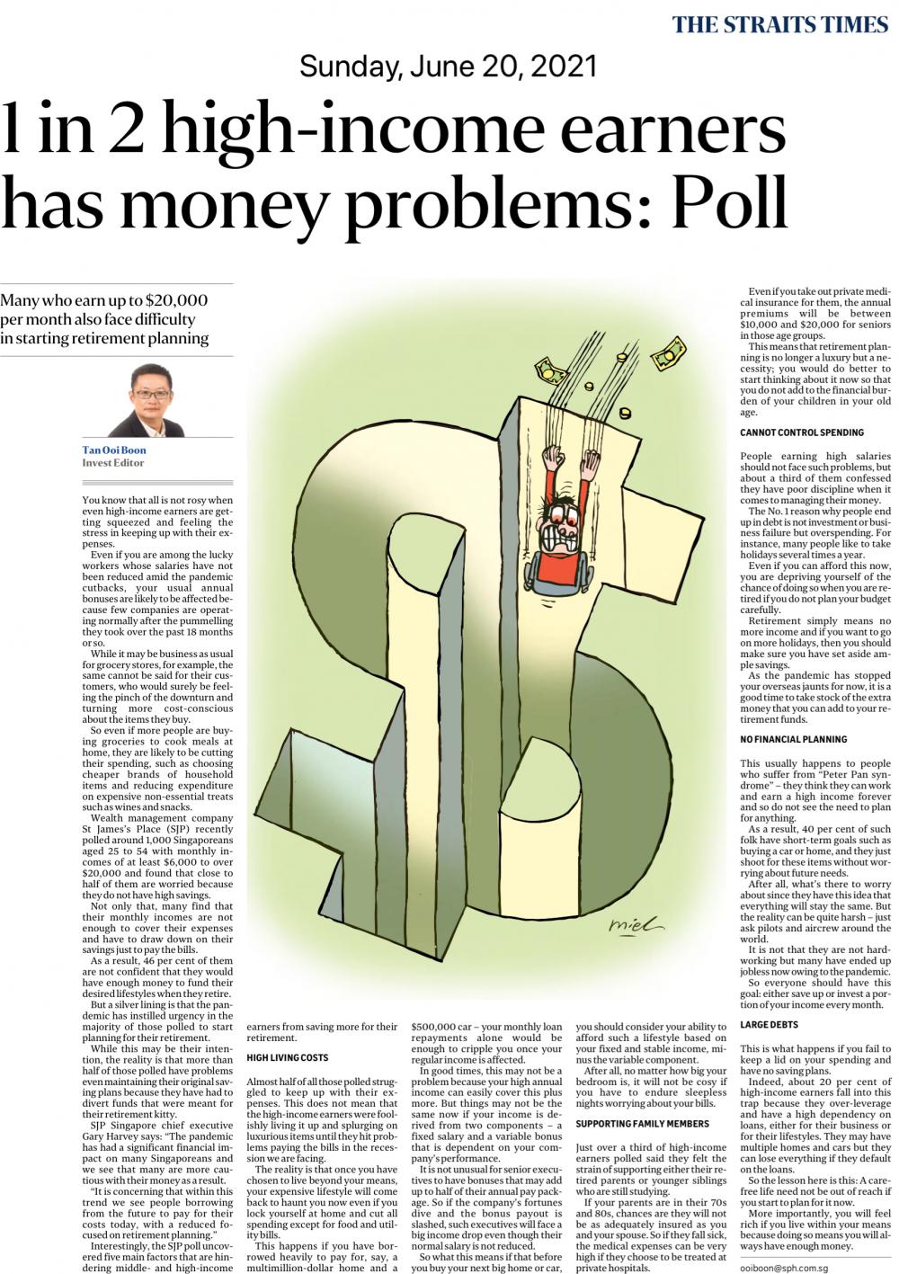 全文A recent poll conducted by a wealth management company St James’s Place Asia (SJP Asia) found that one in two high-income earners in Singapore are facing money issues.