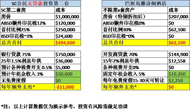 虽然你可能看不上5%的年固定租金回报,也可能对巴厘岛免费度假毫无兴趣,不过房产投资最重要的杠杆属性可不能忽略,因为新加坡房产的降温措施和TDSR,导致贷款越来越困难,就算第一套还清了,第二套的投资成本也是极高,而且不一定能做到收支平衡,一图看懂两者对比: