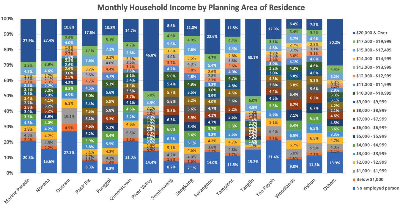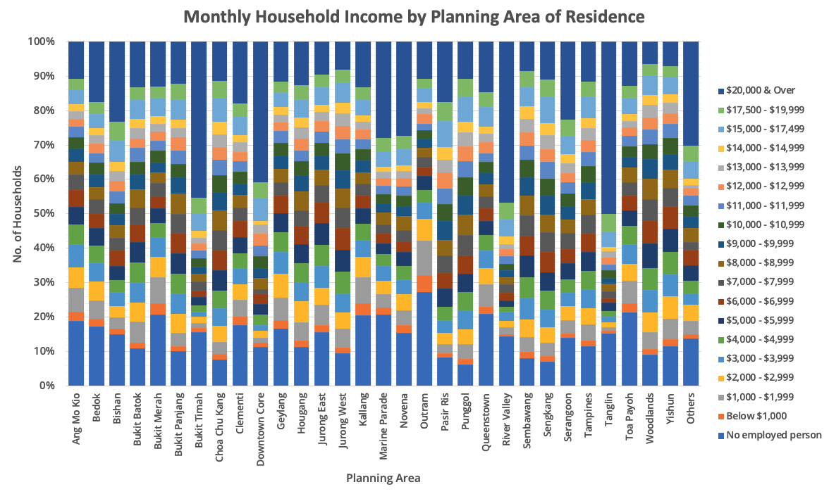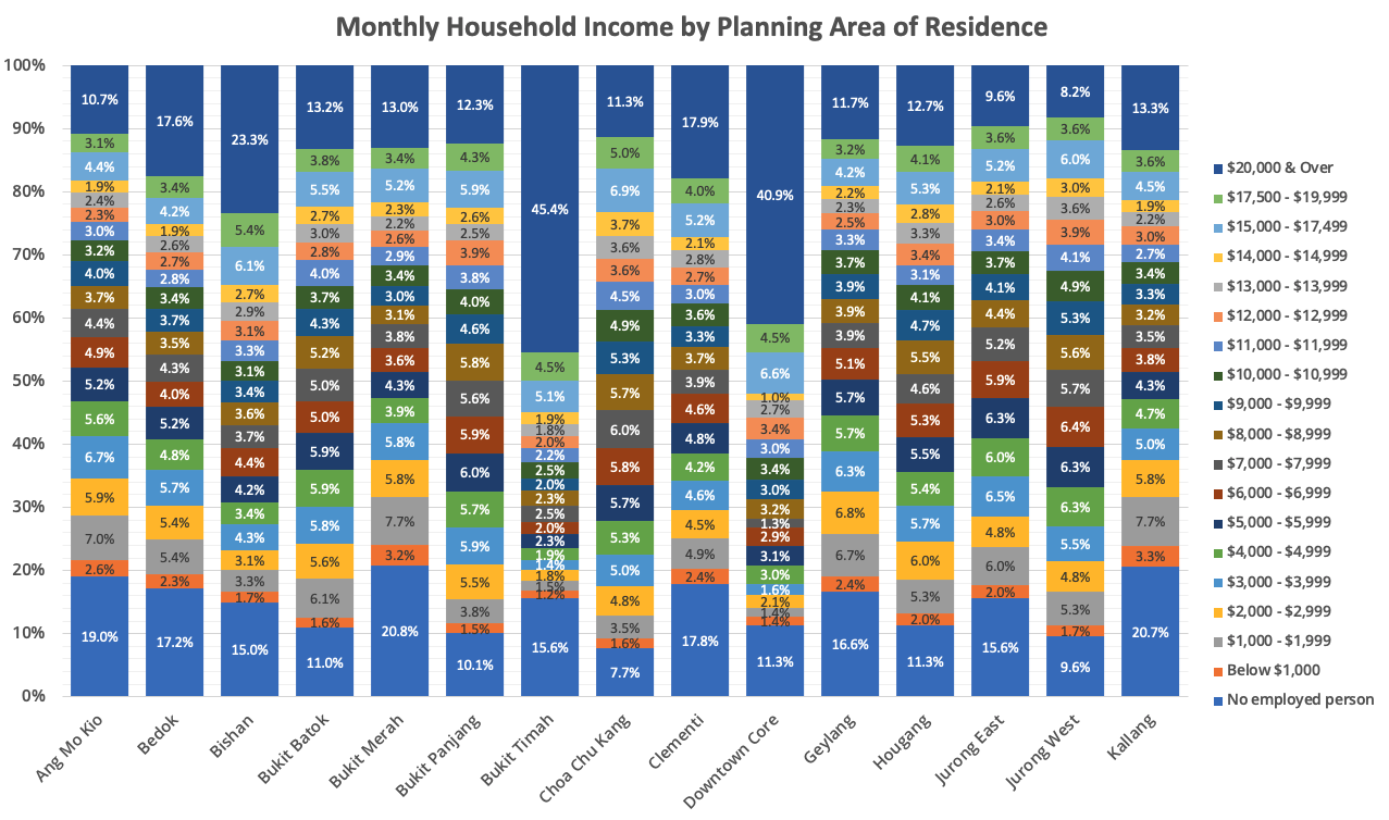 Area of ResidenceMedian Monthly Household IncomeAng Mo Kio$5,000 to $5,999Bedok$7,000 to $7,999Bishan$9,000 to $9,999Bukit Batok$7,000 to $7,999Bukit Merah$5,000 to $5,999Bukit Panjang$7,000 to $7,999Bukit Timah$15,000 to $17,499Choa Chu Kang$8,000 to $8,999Clementi$7,000 to $7,999Downtown Core$15,000 to $17,499Geylang$5,000 to $5,999Hougang$7,000 to $7,999Jurong East$6,000 to $6,999Jurong West$7,000 to $7,999Kallang$5,000 to $5,999Marine Parade$8,000 to $8,999Novena$9,000 to $9,999Outram$3,000 to $3,999Pasir Ris$10,000 to $10,999Punggol$9,000 to $9,999Queenstown$6,000 to $6,999River Valley$17,500 to $19,999Sembawang$8,000 to $8,999Sengkang$9,000 to $9,999Serangoon$9,000 to $9,999Tampines$8,000 to $8,999Tanglin$20,000 and aboveToa Payoh$5,000 to $5,999Woodlands$7,000 to $7,999Yishun$6,000 to $6,999Others$10,000 to $10,999via https://ibit.ly/gF0L