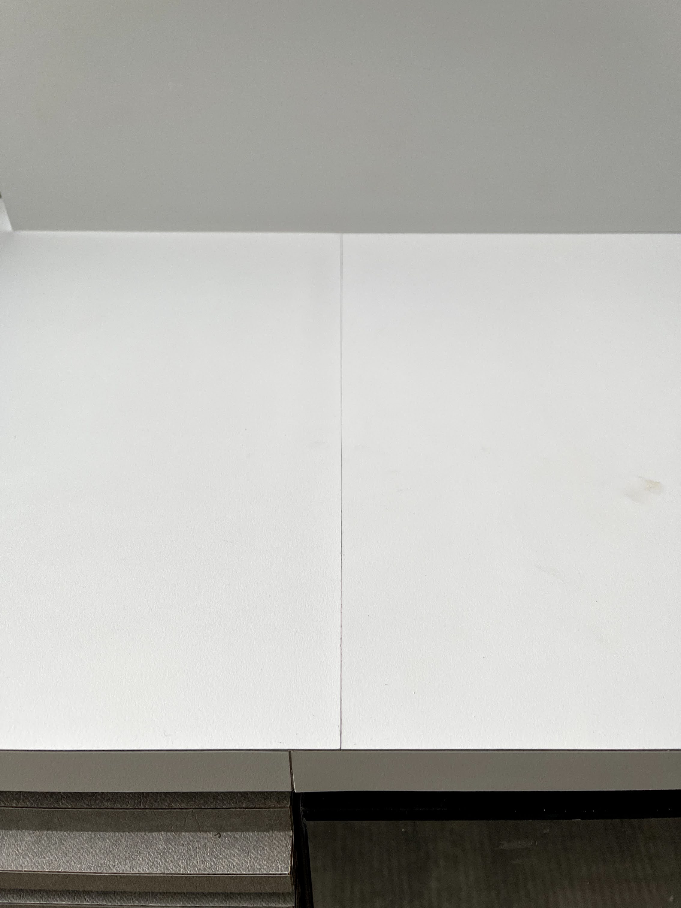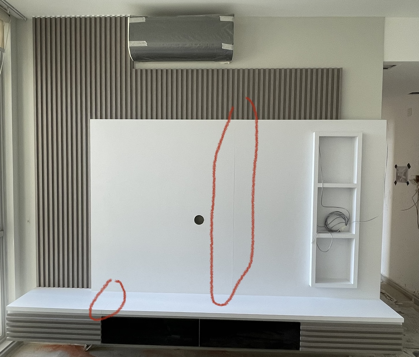风雨不动安如山 • • 3254 次浏览装修商做的电视墙,和下面的抽屉台面,贴皮是拼接的,图中红圈。而且接口还不对齐。