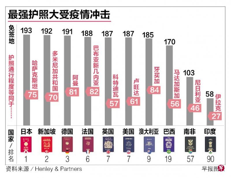 以新加坡护照为例,提供免签或落地签证待遇的地点从192个减少到70个,