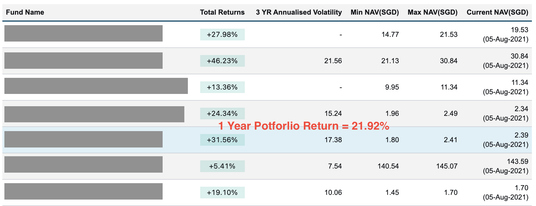 在如此动荡的投资环境下,定期例行对所管理的资产组合进行review,最新的回报率数据如下表所示,即使资本市场剧烈波动,但基金组合的过去一年加权回报率仍然稳定在 21.92%(与7月初的回报率22.4%基本持平),所以,再次说明了,选择正确的投资策略不但可以有效对抗风险、最大幅度降低市场波动对收益组合的影响,而且还可以保障本金和收益的安全性。