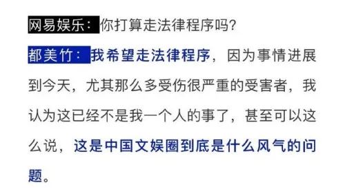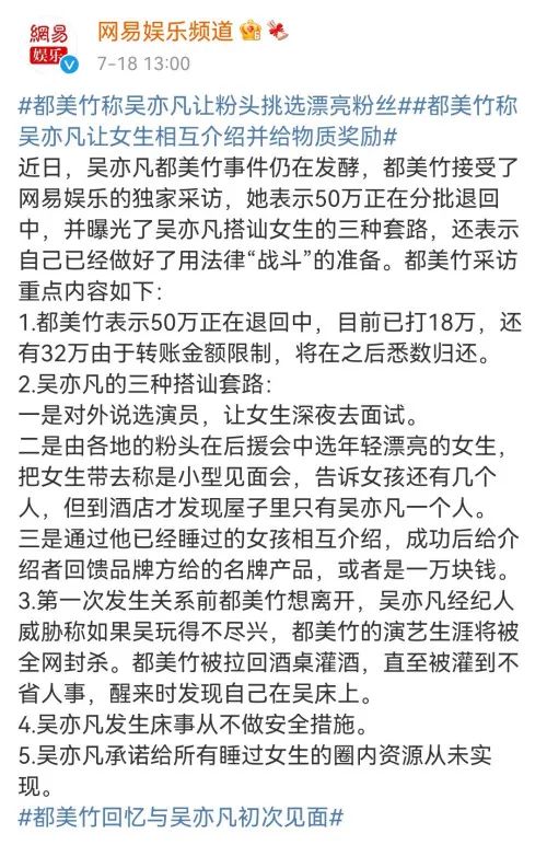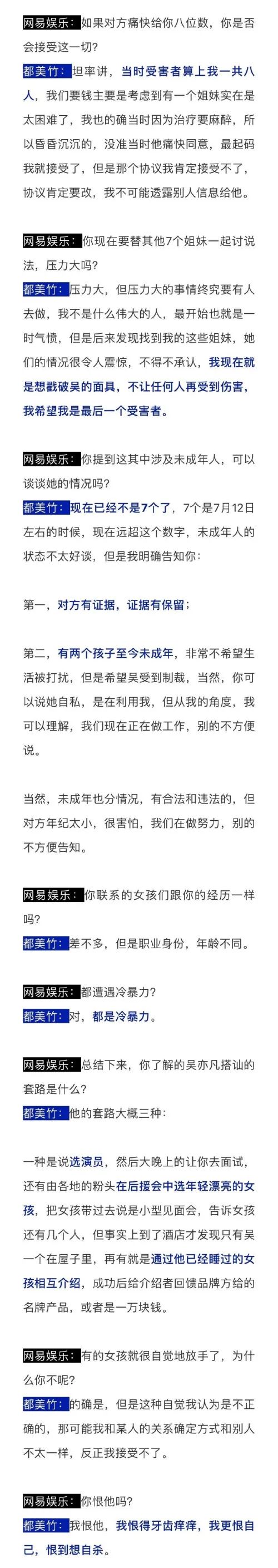 18日,都美竹在接受网易娱乐采访时表示,吴亦凡以选演员等为借口,物色、诱骗年轻女性。包括自己在内共有8名受害人,其中有两个女孩至今未成年。都美竹称收到50万封口费,正在分批退回。她已经做好走法律程序的准备,用法律“堂堂正正地战斗”。