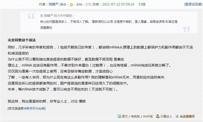 完全同意这个说法同时,几乎所有的专家和报告,(包括天朝自己的专家),都说明mRNA从原理上到数据上都保护力和副作用都由于灭活和减活疫苗的