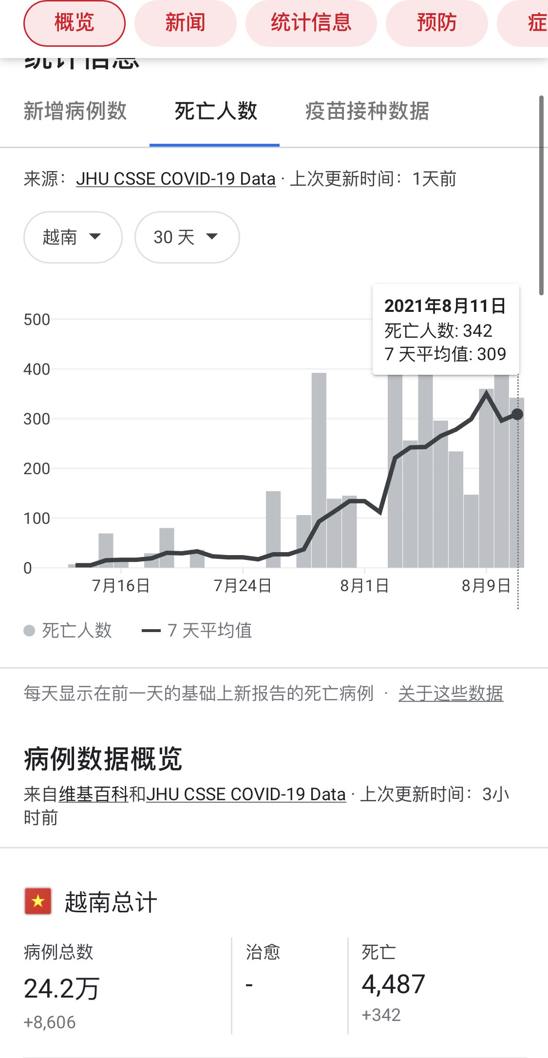 截止8月12日上午,越南累计确诊病例241534例,其中境外输入病例2384例和本土确诊病例239159例。4月27日至今的本土确诊病例237589例,其中康复病例82380例。