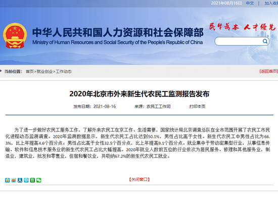2020年监测数据显示,新生代农民工占比达到50.1%,男性占比高于女性。新生代农民工中男性占比为66.3%,比上年提高4.6个百分点;男性占比高于女性32.5个百分点,比上年提高9.1个百分点。就业集中于劳动密集型行业,从事信息传输、软件和信息技术服务业的新生代农民工占比大幅提高。2020年就业人数前五位的行业依次为居民服务、修理和其他服务业,制造业,建筑业,批发和零售业,住宿和餐饮业,共吸纳67.2%的新生代农民工就业。