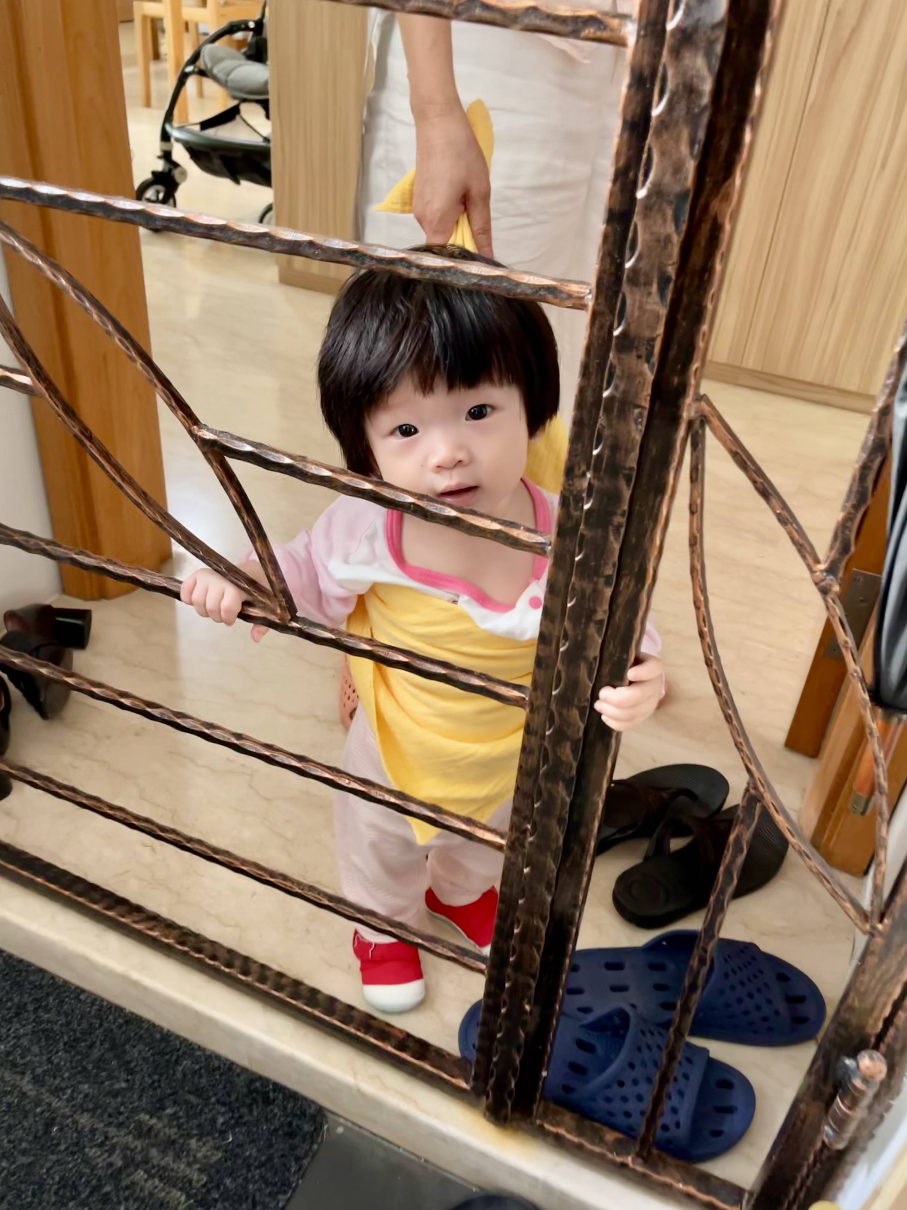 Lovely头发这么多,双手抓门,平衡能力不错,为啥不乐呐,有的奶娃会笑得眼成一条缝啊,看来门外的是奶爸。