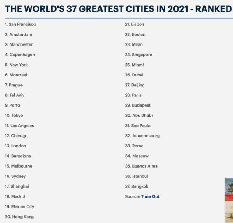 (《Time Out》)据《Time Out》透露,这个排行榜是由该杂志派驻世界各地的编辑分头访问各城市合共2万7000居民的结果整理而成。