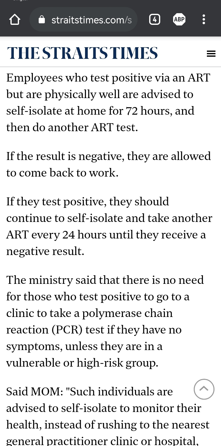 我也觉得有问题第一,ART阳性的时候,只是be advised to, 不是must,甚至都不是should。也就是说我想出门,想上班甚至想堂食还是没问题的,因为没有QO的话,并没有违反任何条例。