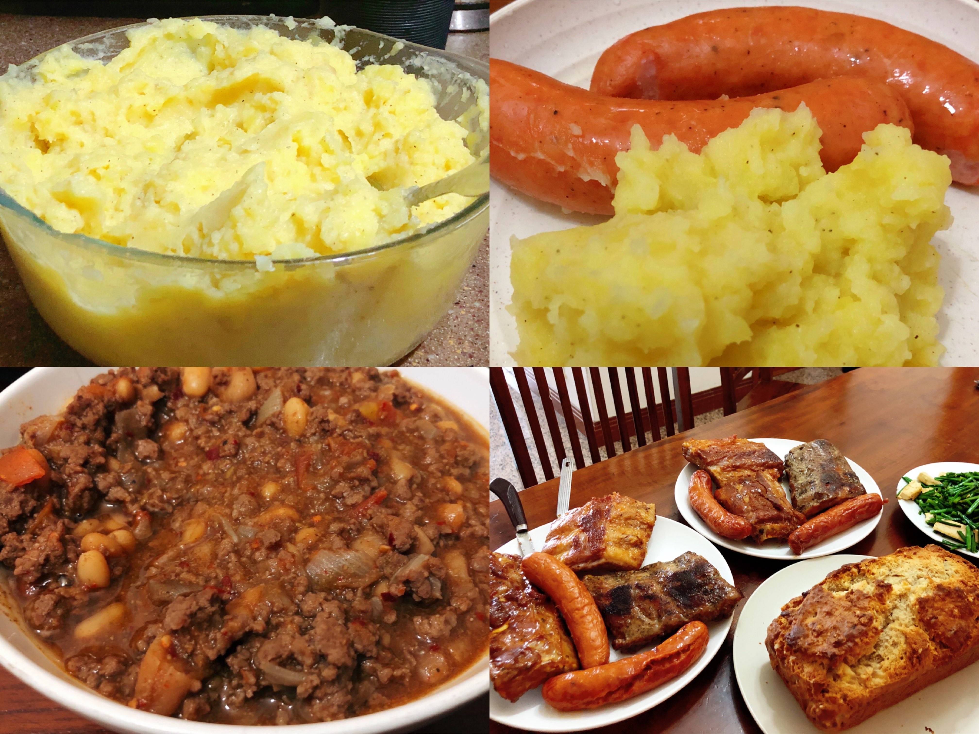 土豆泥最容易做了,我一般煮六七个大土豆,弄成泥加黄油(越多越香)牛奶盐胡椒,不算电饭锅煮的时间的话十分钟搞定;) 牛肉酱是Chili con carne,网上很多食谱,我这种懒人就直接加洋葱炒炒,倒上牛肉碎chili调料粉(cold storage有卖)蕃茄罐头豆子罐头煮几十分钟就行了,一般一次两斤牛肉可以吃好几顿~~