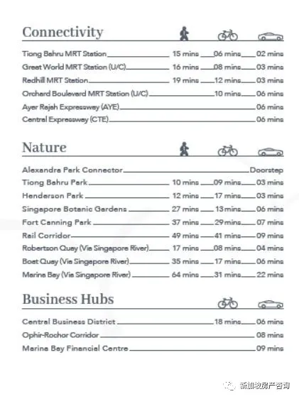 休闲方面,公寓出门就是亚力山大公园连接道,通过这个连接道可以直接通往滨海湾,新加坡河畔的罗波申码头和克拉码头。
