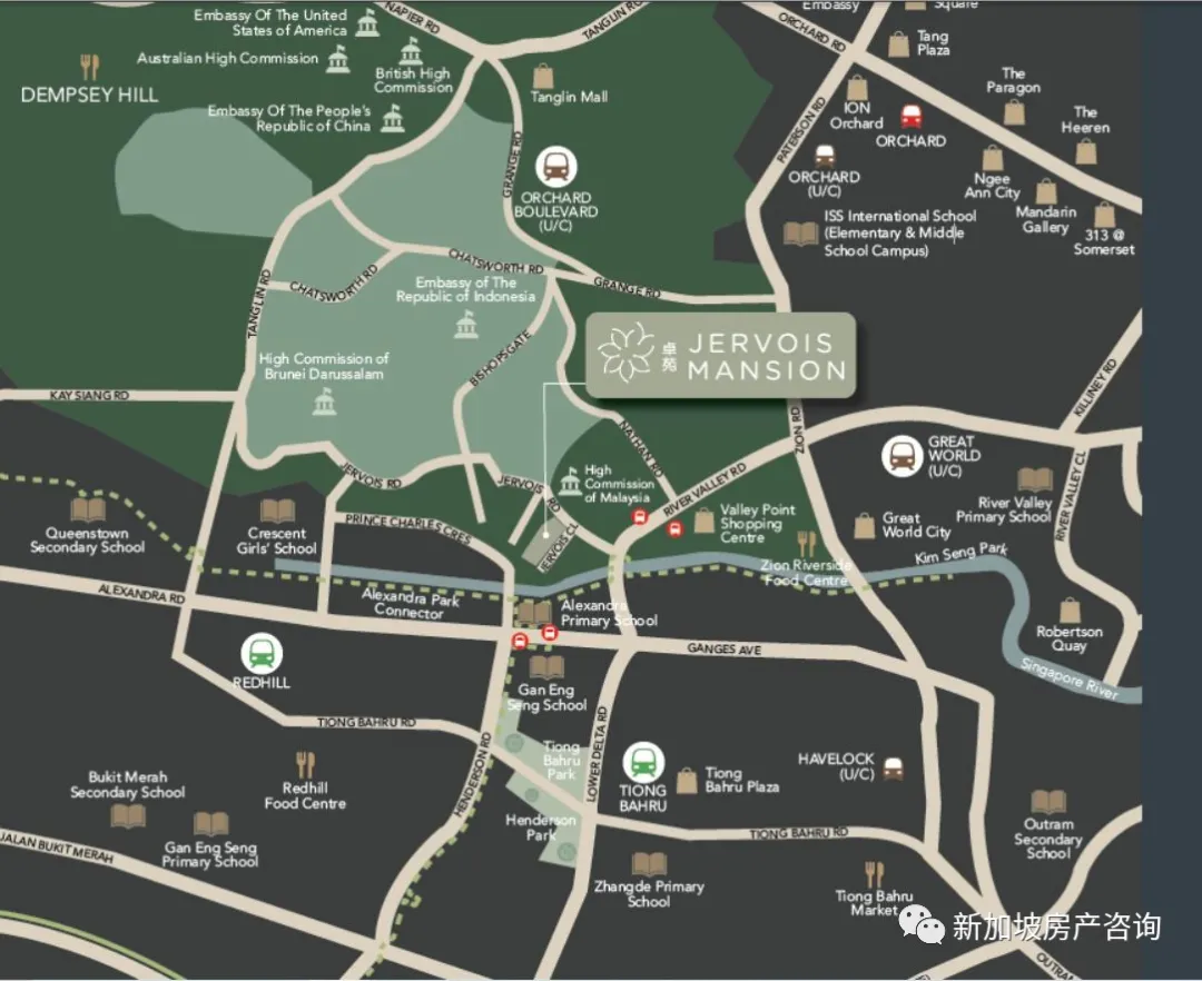 Jerviois Mansion 所在的第10邮区属于新加坡的核心邮区,它所在泽维士路非常靠近乌节路,新加坡河和中央商务区,这个地段也是多个国家的大使馆所在地,周边住宅多为别墅洋房,居住在这个地段既能享受使馆洋房区的高尚宁静生活,又与乌节路的繁华近在咫尺。