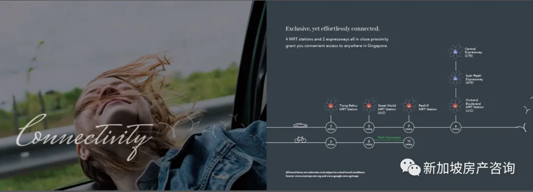 公寓周边有四个地铁站,位于绿线的中峇鲁、红山地铁站,以及将于2022年建成的位于褐色线路的大世界地铁站和乌节林荫道地铁站。沿着绿树成荫道路大概步行10多分钟到达。