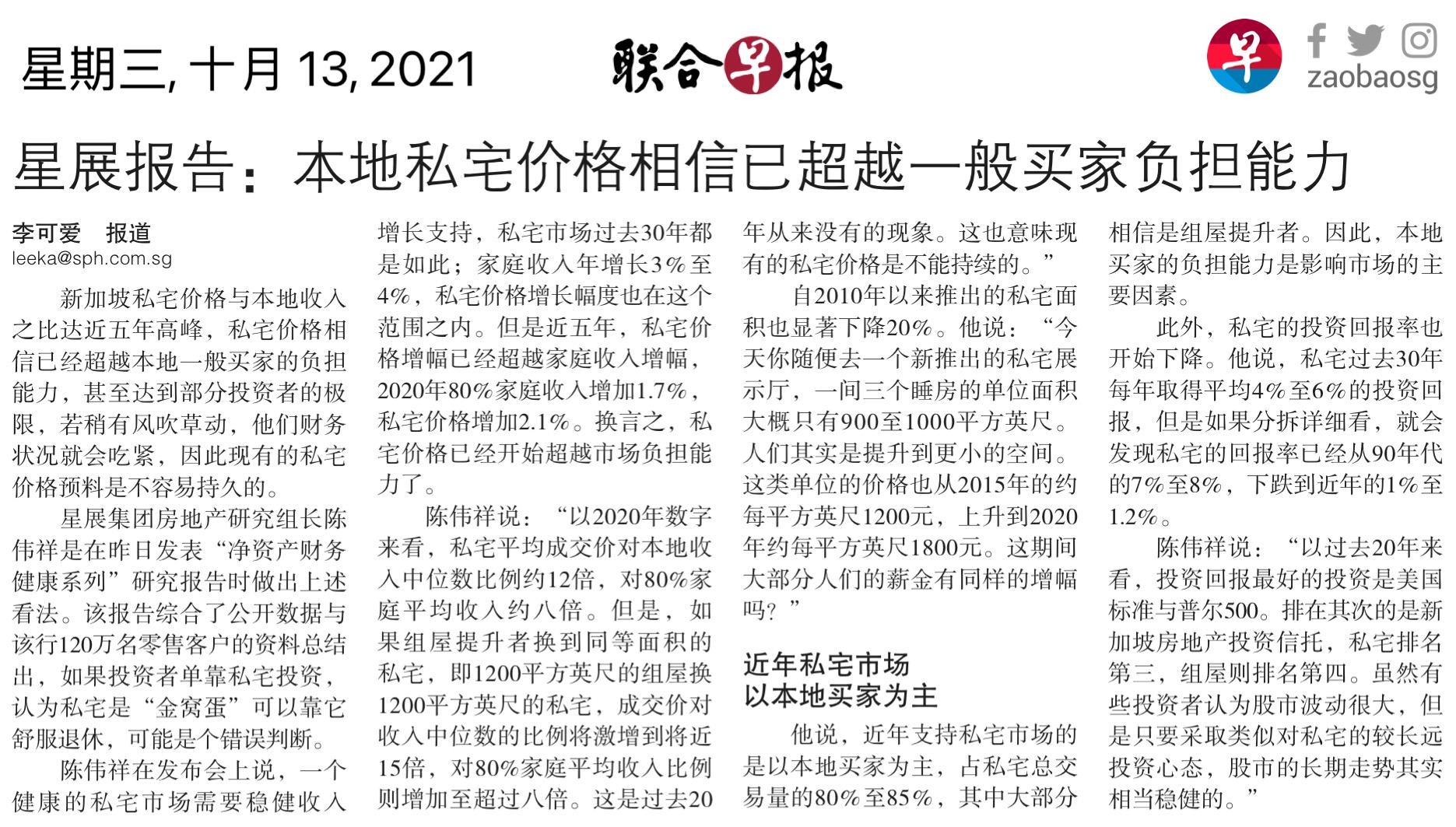 反驳一下楼主和DBS的报告1.本地私宅是80分位年收入的八倍多,相当健康。这群人的收入增加较快,所以私宅价格增加的快正常。
