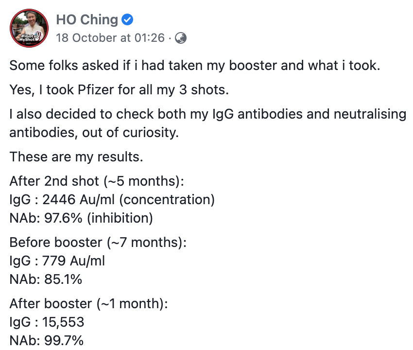 没有预约,直接去了社区中心。到那里后,那里的人建议先去做个血清检测,以决定是打一针作为加强针还是从头打两针。就找了一家诊所去做了。血清检测倒是很快,抽血时说三天后会出结果,实际只要一天就出来了。疫苗记录在TraceTogether里面更新,诊所说要三周,实际上两天后就更新了。刚好我们昨天下午又去社区中心,准备打疫苗的时候,就发现TraceTogether里面已经显示为已接种了。