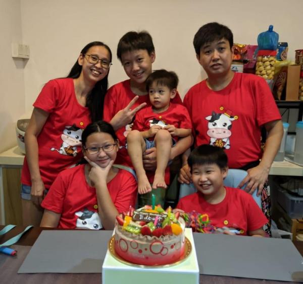 李淑利(后排左一)与丈夫育有四名孩子。一家后来都相继确诊冠病,所幸余者的症状都十分轻微,都能居家隔离慢慢养病。(新加坡国大医院)
