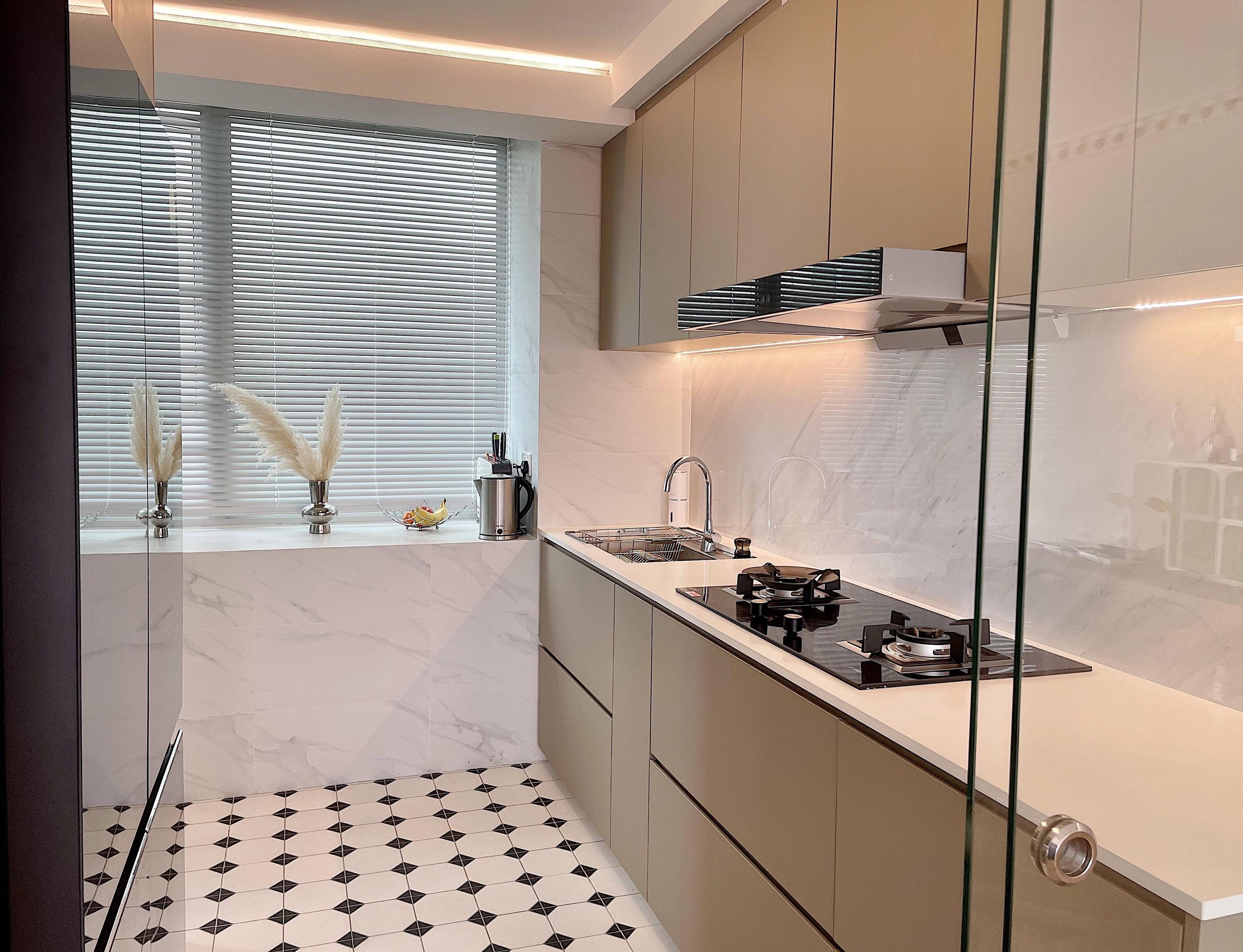 再来说下布局,冰箱高柜那边的布局,左边放冰箱(日立镜面款yyds),右边跟视线齐平做了嵌入式的蒸烤箱(bosch)最下面放了站立式洗碗机(也是bosch,lazada半价入手不要太香)因为提前预留了洞,所有电器都做到严丝合缝,看着太舒适,哈哈哈!然后亮点来了,洗碗机和蒸烤箱中间加了个抽屉,刚好收纳洗碗块和烘培用品,不用每次弯腰,用下来知乎内行[斜眼R]