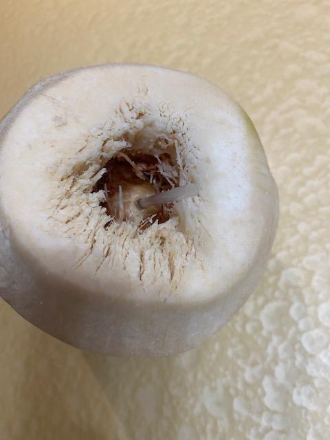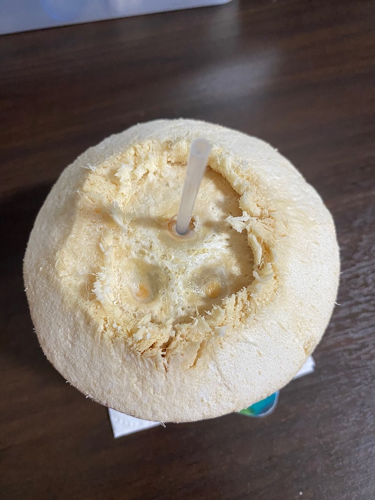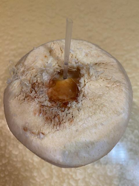 越来越熟练熟能生巧,开椰子这事越来越熟练。 现在已经不必用刀切掉部分底部的外皮,直接用剪子剪几下就找到了。