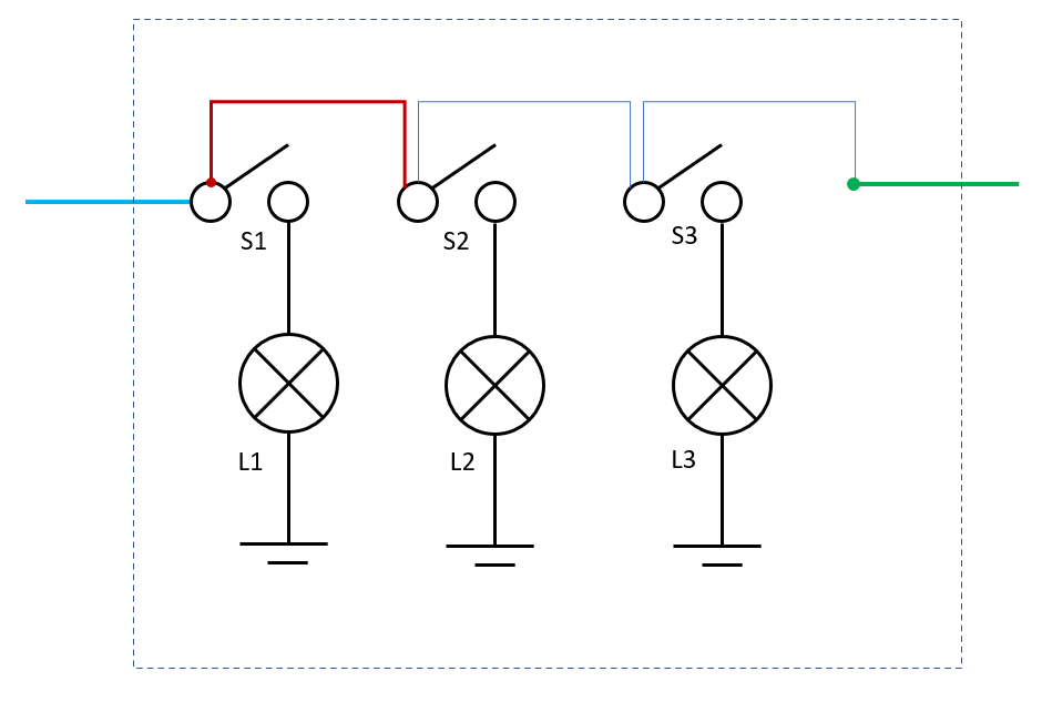 因为S1到S2的那条红线没接好,所以,S2和S3,以及后续的绿线其实是没有电状态。只有灯L1能亮。