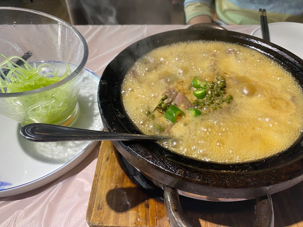 青菜平时很少看到老板,今天他也在店里,帮忙招呼客人,顺便检查工作。一个服务员上菜时他特意走过来看来一下菜单:“诶?没点米饭?”我赶紧说:“不用不用,我们店里南瓜饼。” 今天的青菜味道比较淡,和老板要了刀叉,把菜切开,丢到石锅肥牛的汤里面泡了一会而再吃,竟然非常好!!!!