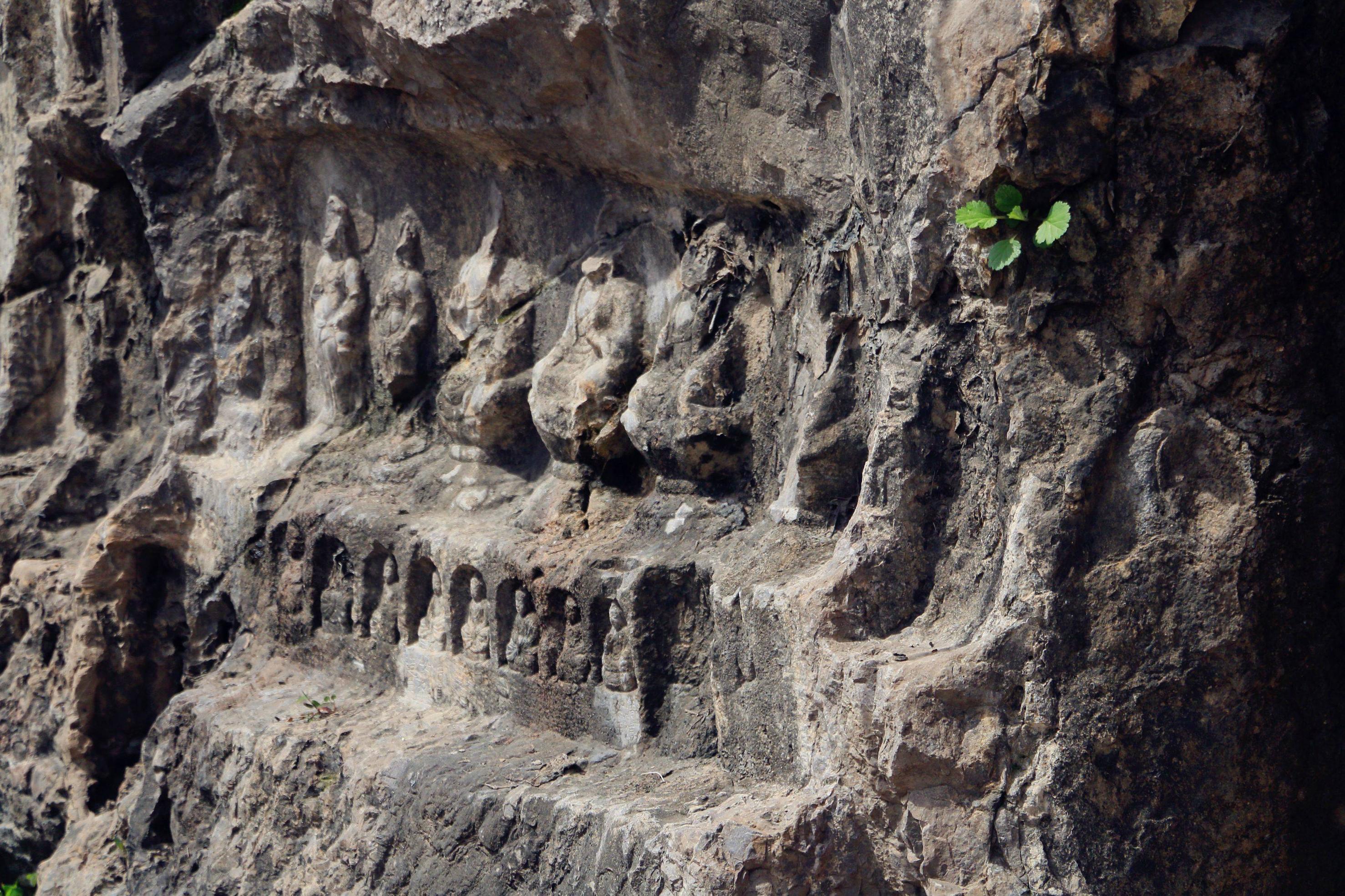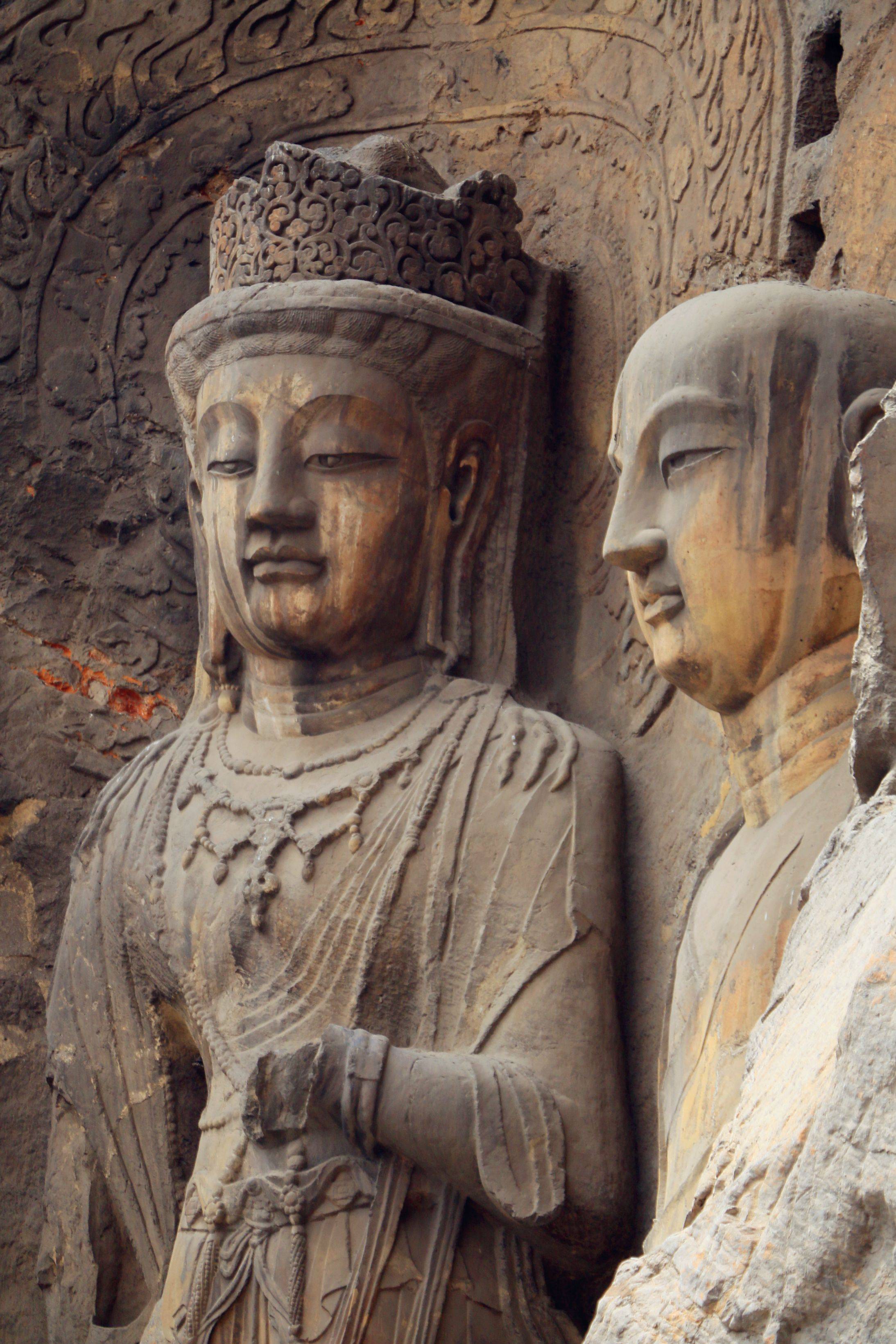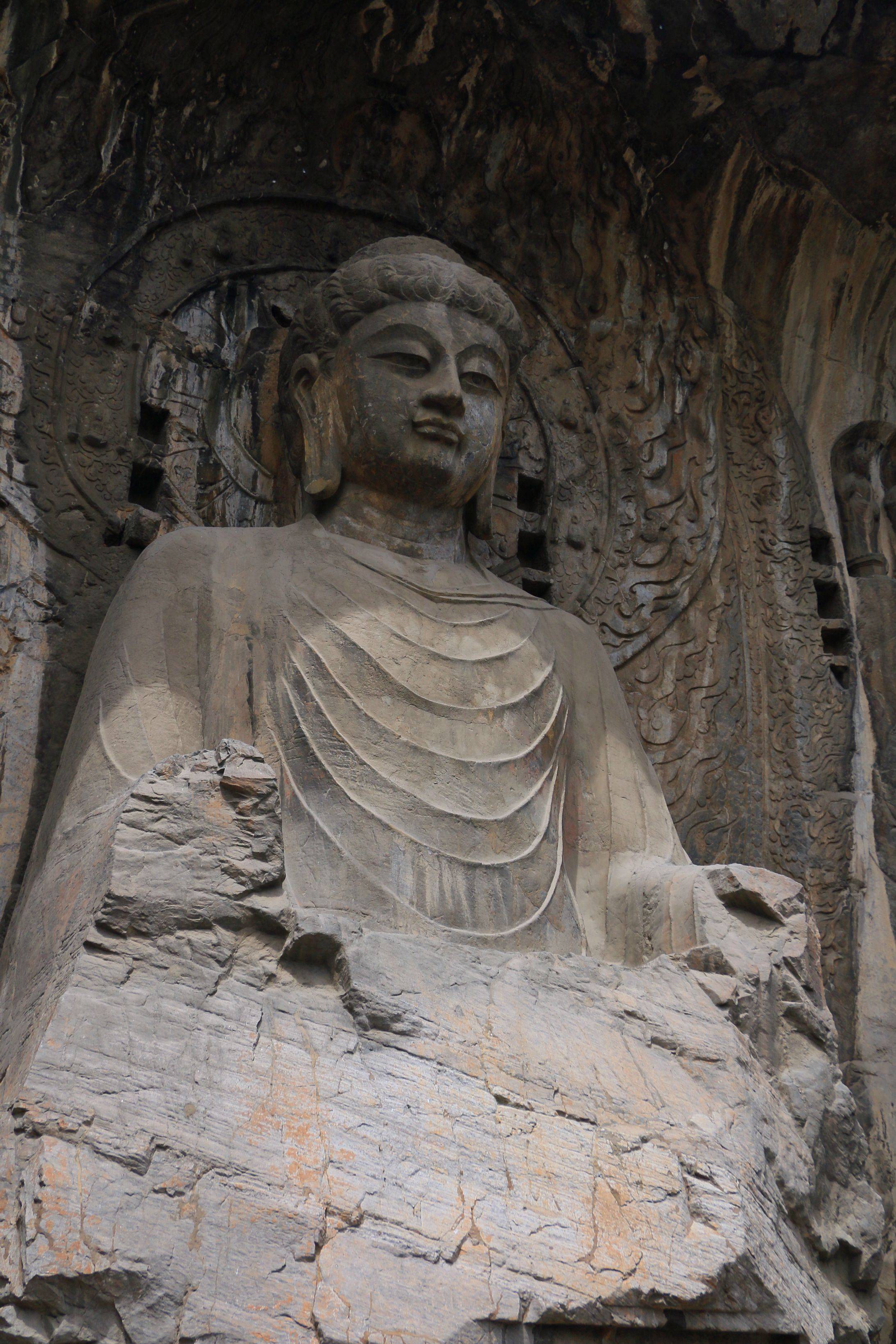 次日去的是龙门石窟,向往很久的所在。参过的佛像貌似以北魏和唐代为主,风格略有不同。皇室所建造的雕像多在比较大的洞穴之中,沿途那些小的可能多出于民间了。一路看过还是挺壮观的,佛像容姿端凝衣着风流,最引人注目的还是奉先寺,这座没有被偷盗过多是经风化损害,相对其他更完整些,雕像亦是美轮美奂,神姿各异如众生百相。中间是以武则天为原型的佛像,唇角含笑,一种令人看不厌移不开视线的魔力。