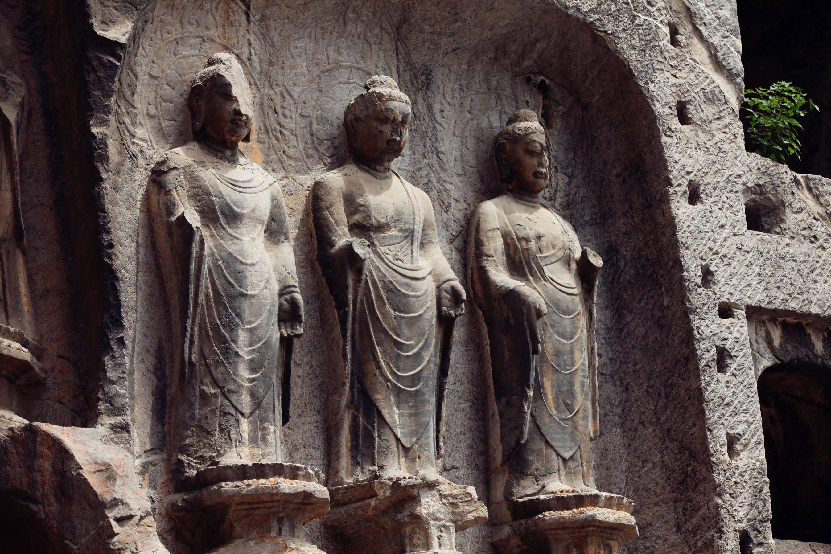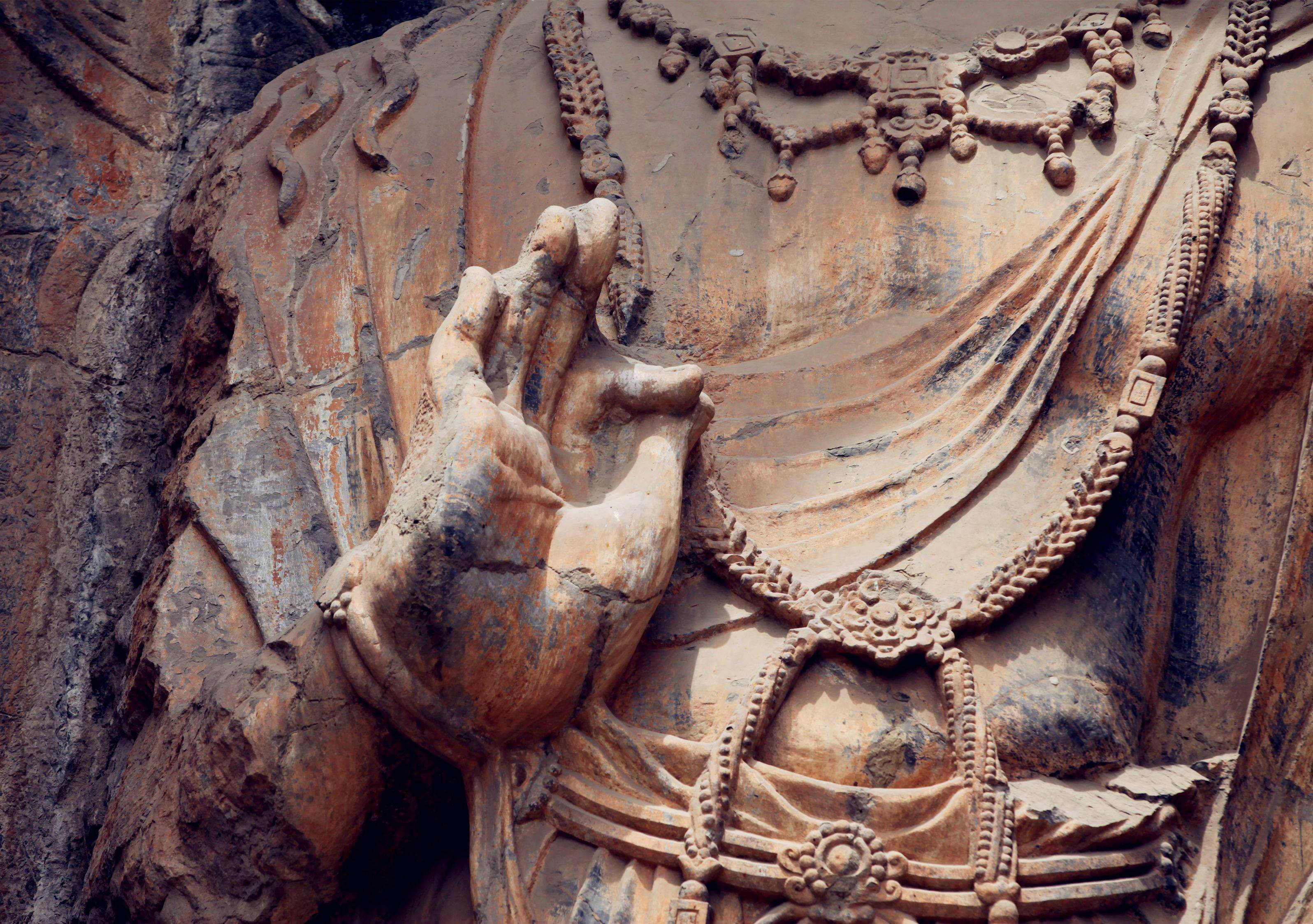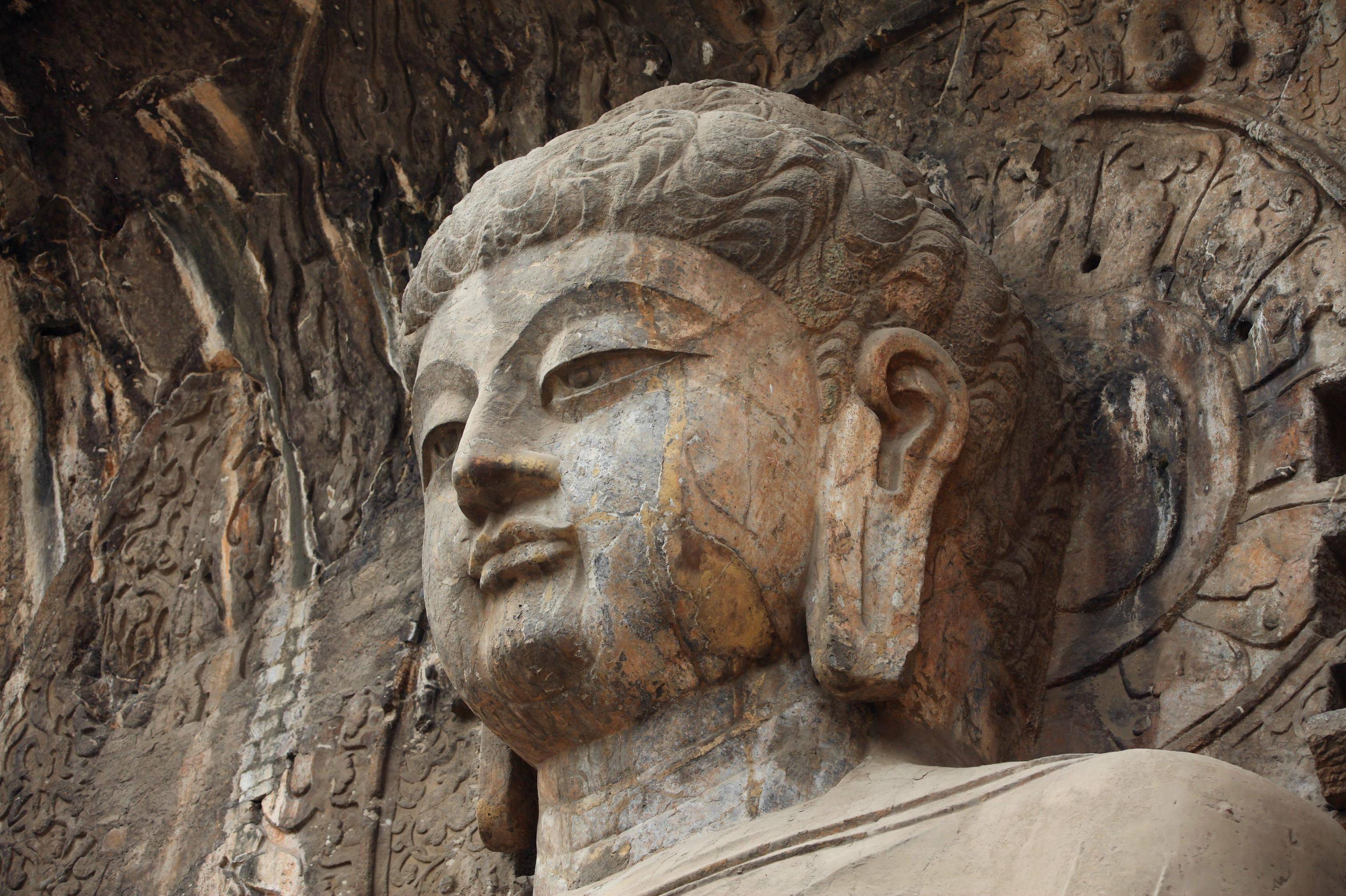 次日去的是龙门石窟,向往很久的所在。参过的佛像貌似以北魏和唐代为主,风格略有不同。皇室所建造的雕像多在比较大的洞穴之中,沿途那些小的可能多出于民间了。一路看过还是挺壮观的,佛像容姿端凝衣着风流,最引人注目的还是奉先寺,这座没有被偷盗过多是经风化损害,相对其他更完整些,雕像亦是美轮美奂,神姿各异如众生百相。中间是以武则天为原型的佛像,唇角含笑,一种令人看不厌移不开视线的魔力。