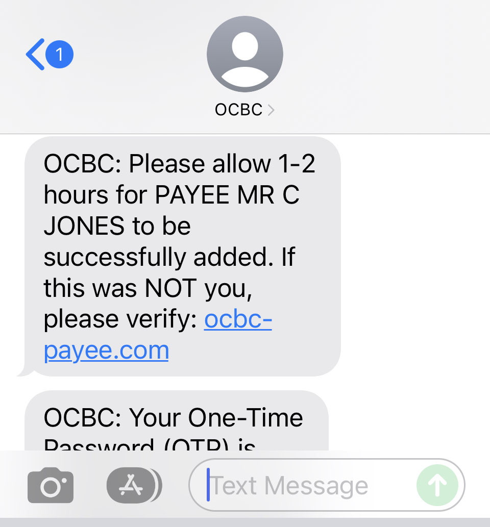 总觉得现在太猖狂了我打给ocbc的时候,ocbc还发给我6位数那个code,竟然跟钓鱼网站给我的短信是一个人thread的,就在同一个名字下!你说说。我是习惯立刻清理全部没用短信的人。如果不清理的人,之前ocbc的短信都在,骗子一发短信,就跟那些银行的短信一个sender,这不是很容易被骗么