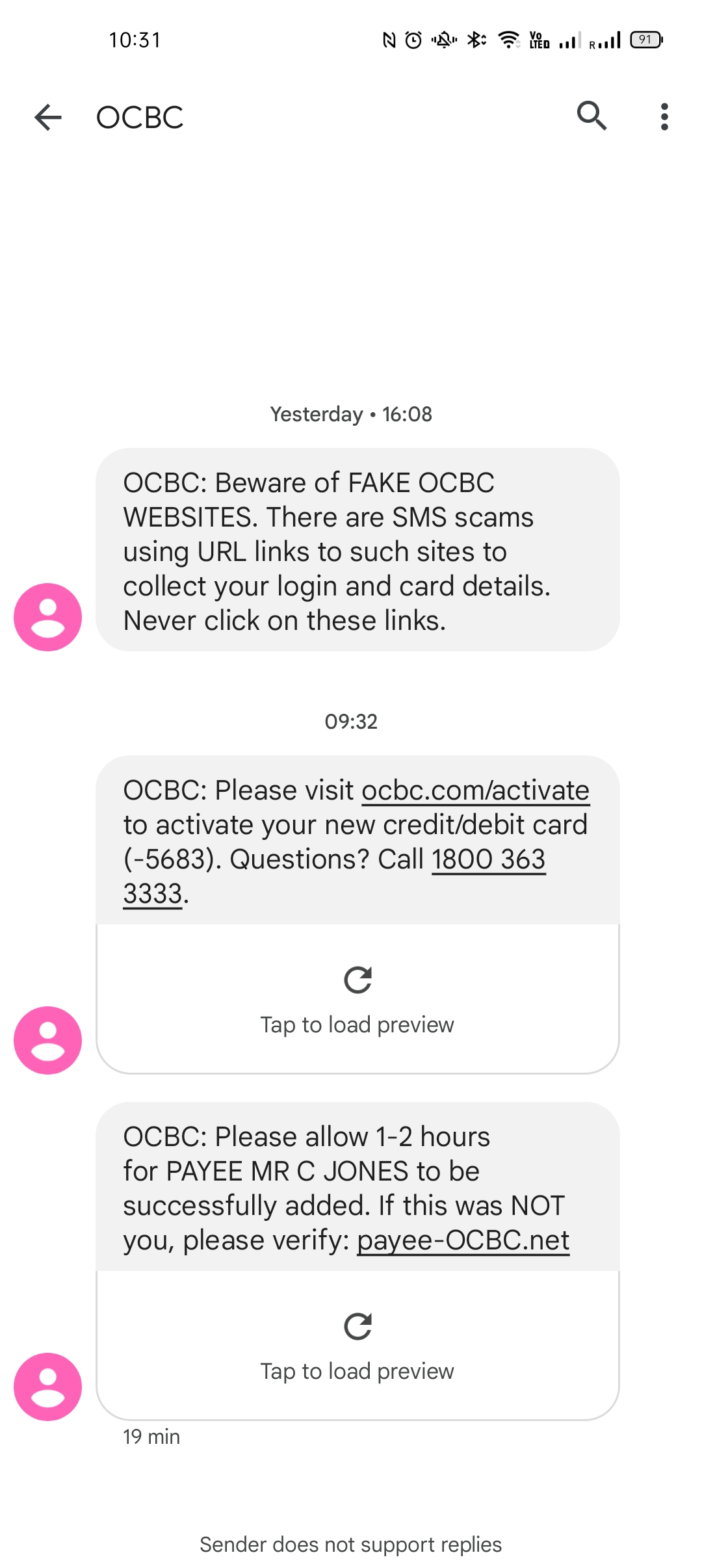 骗子的短信怎么和OCBC官方的看起来是同一个sender啊。。。 -