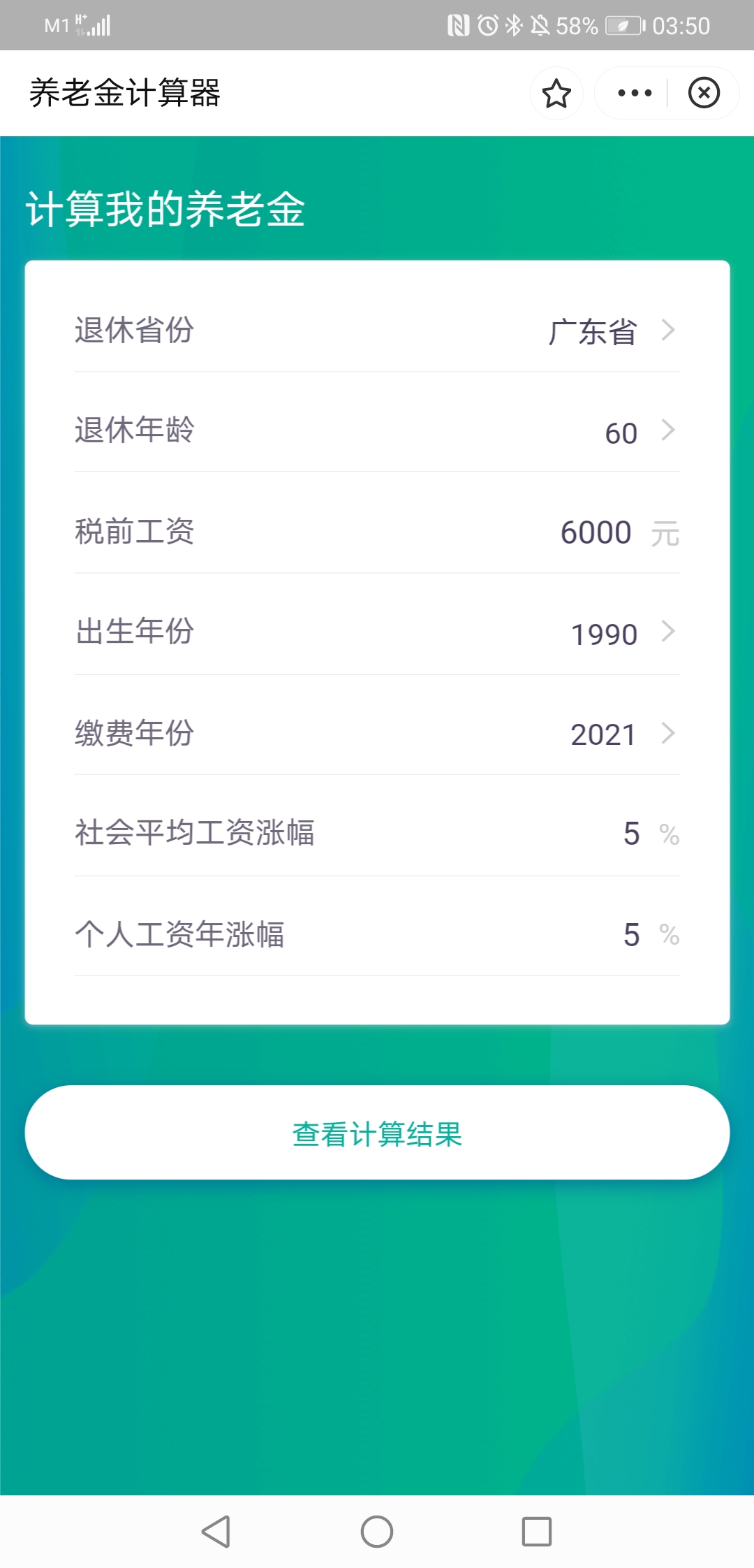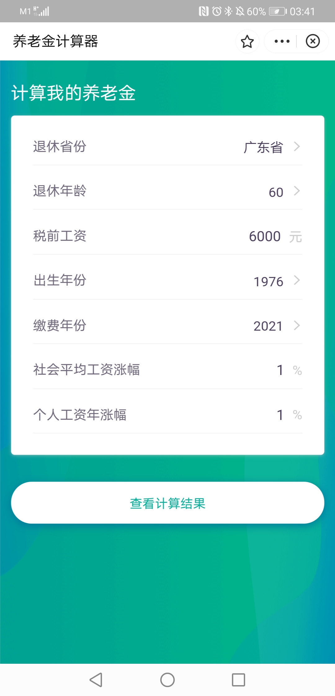 找了个自动计算公式,假设现在已经45岁,从现在开始自己缴纳15年,还是以最低标准6000元。 如图,比我估算的低。