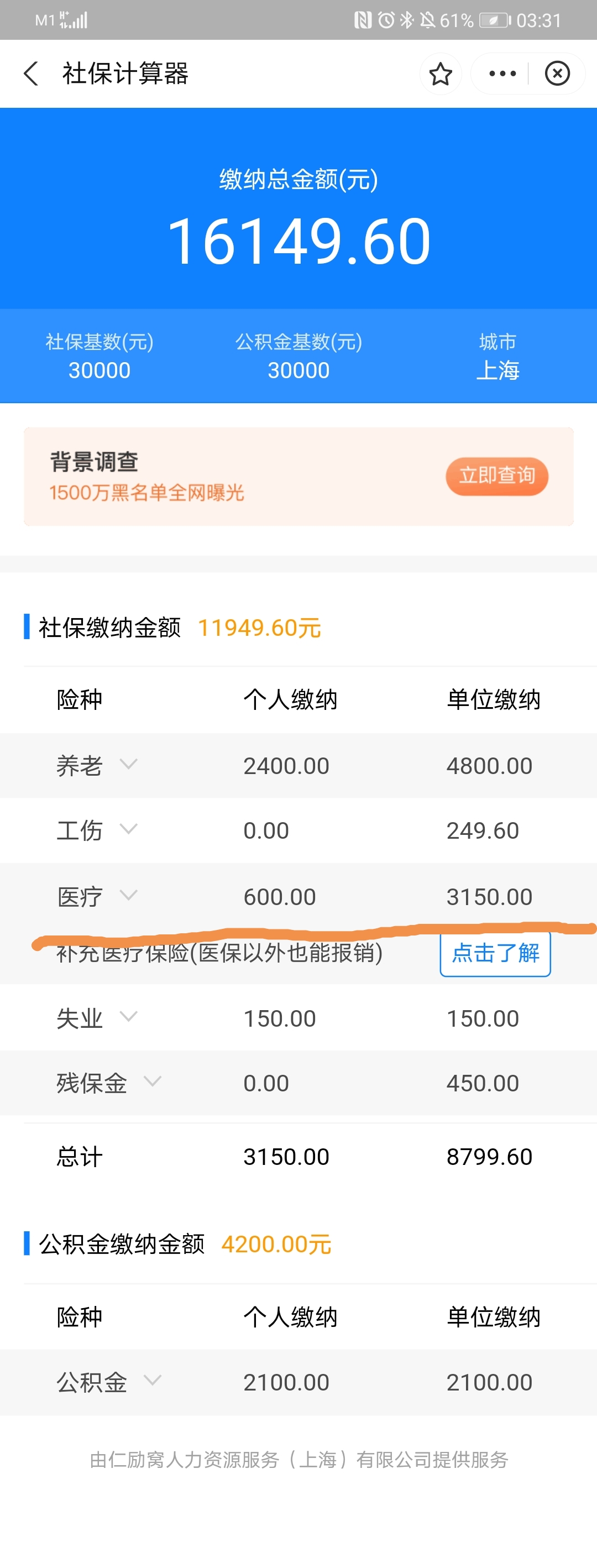 又看了下最高标准三倍缴纳的话,个人加公司缴纳医疗保险费高达3750每个月,4.5万每年。