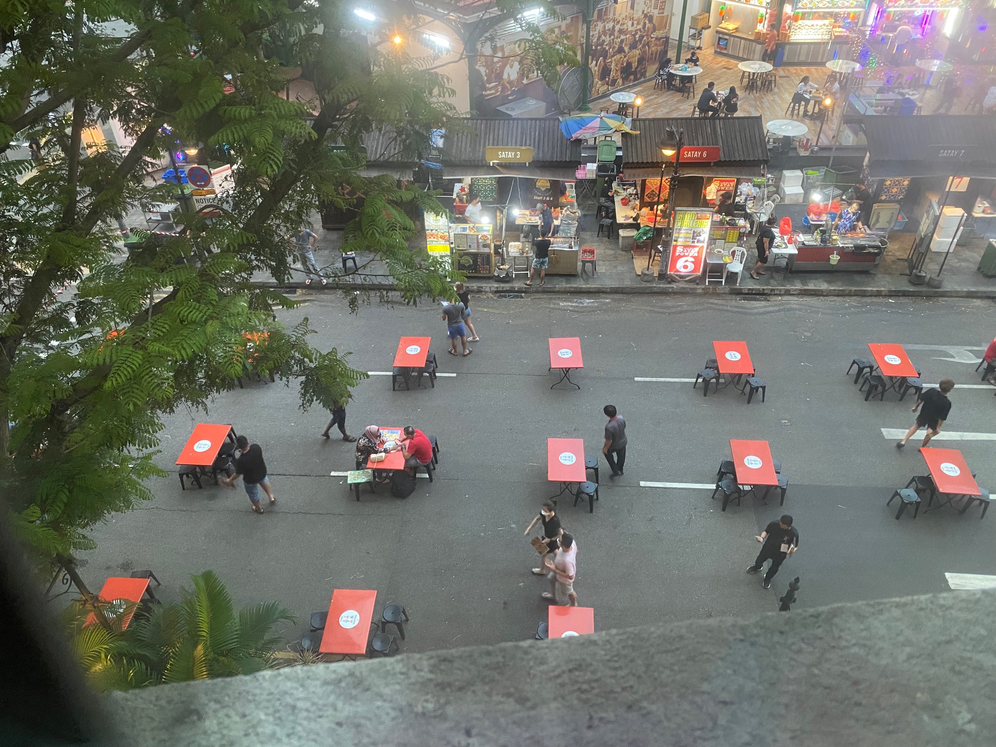 天色晚了摊位开始做准备,楼下的路封了,摆上了桌子。