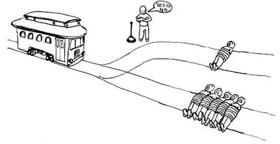 记得还有一个版本是不动扳手,一车人车毁人亡,扳动扳手改变轨道去撞死一个无辜小孩。