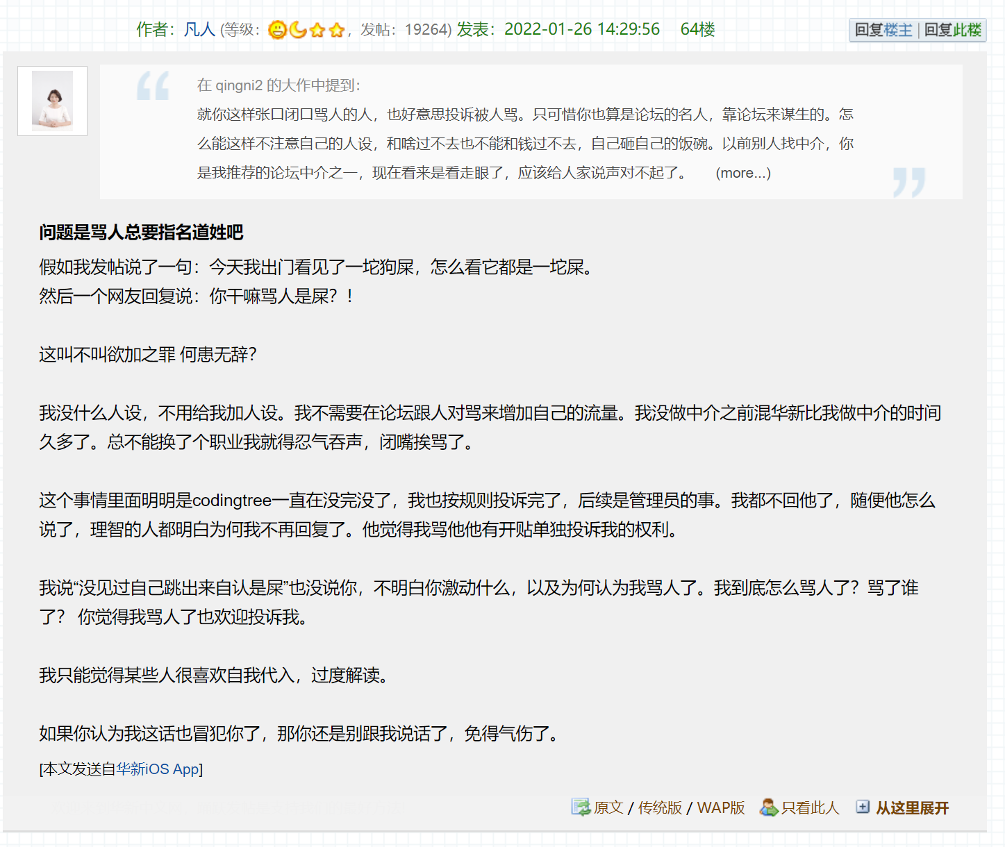 然后凡人觉得那个帖子没指名道姓不算骂人(这个我持保留态度),所以才引出那句话