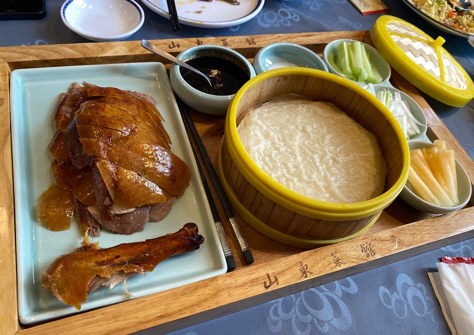 他觉得新加坡的烤鸭比较瘦,这是生鸭的问题,山东菜馆的烤鸭味道好,包烤鸭的饼更好,综合下来山东菜馆是常用菜馆了。